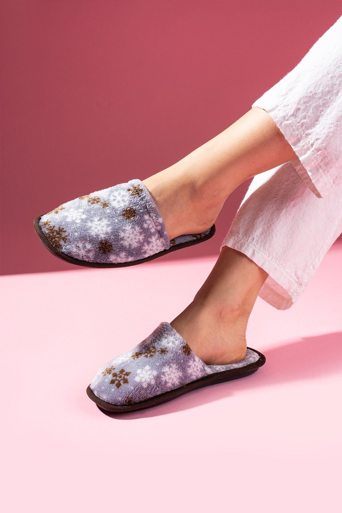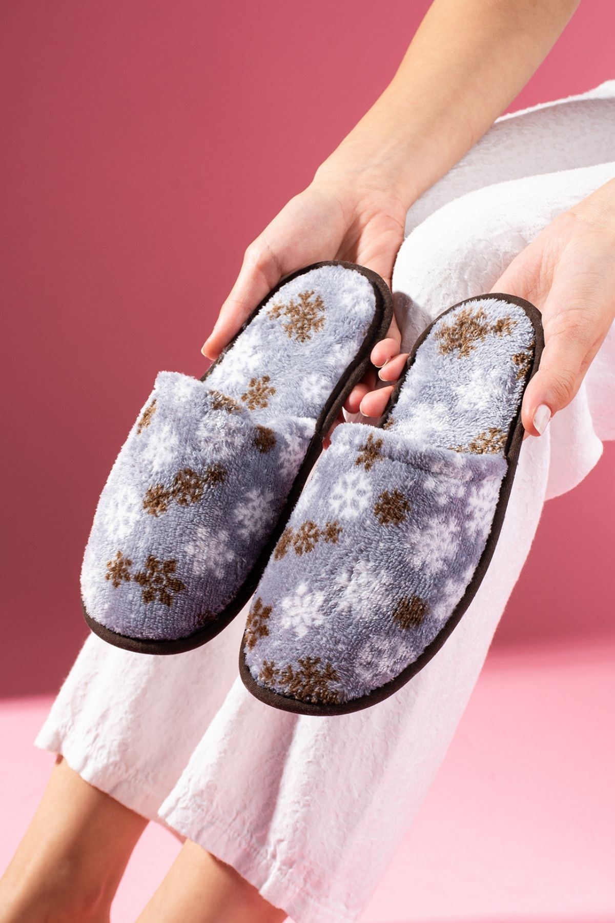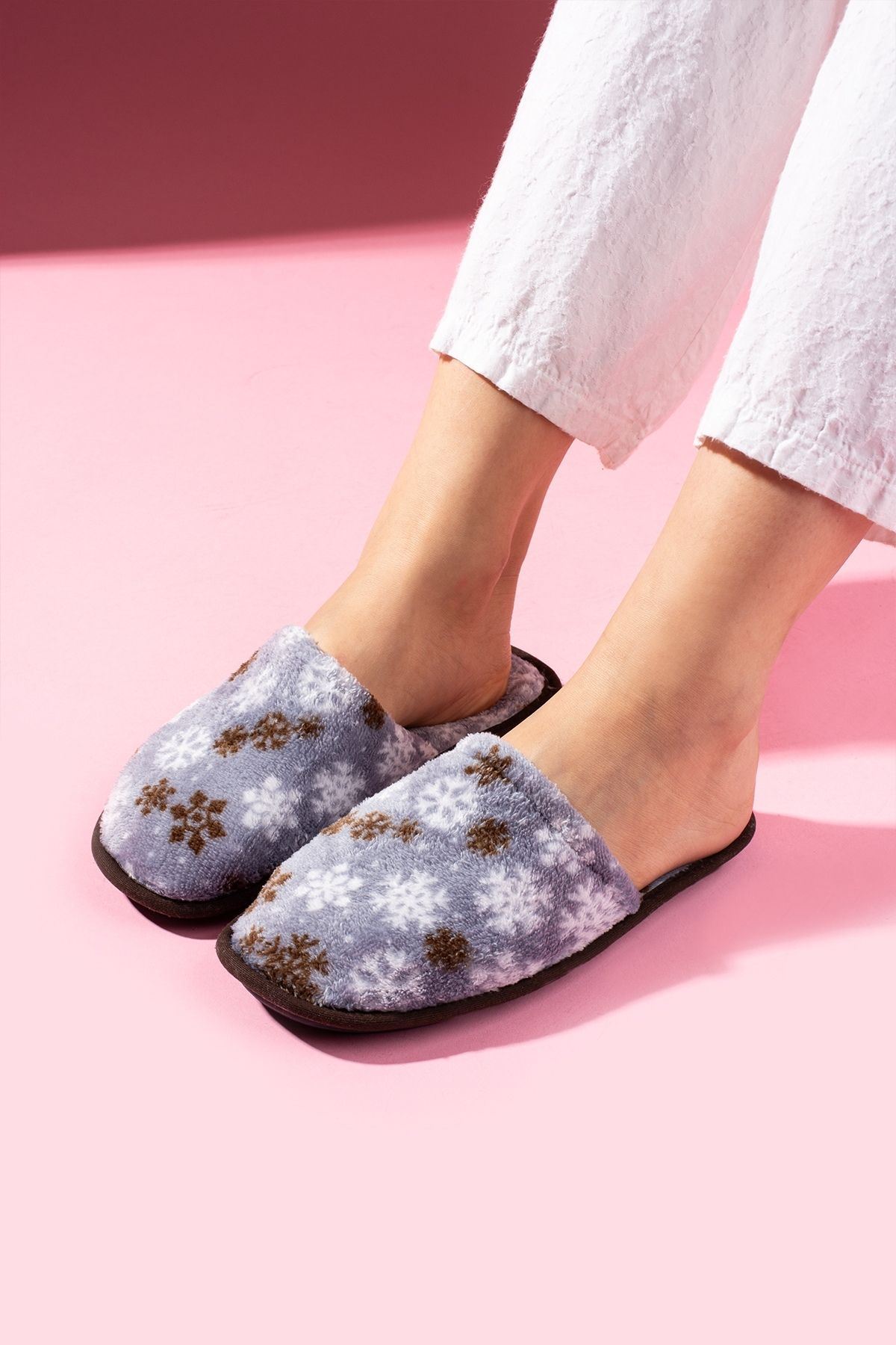 Alice Gri Kar Tanesi Baskı Desenli Önü Kapalı Ev Terliği