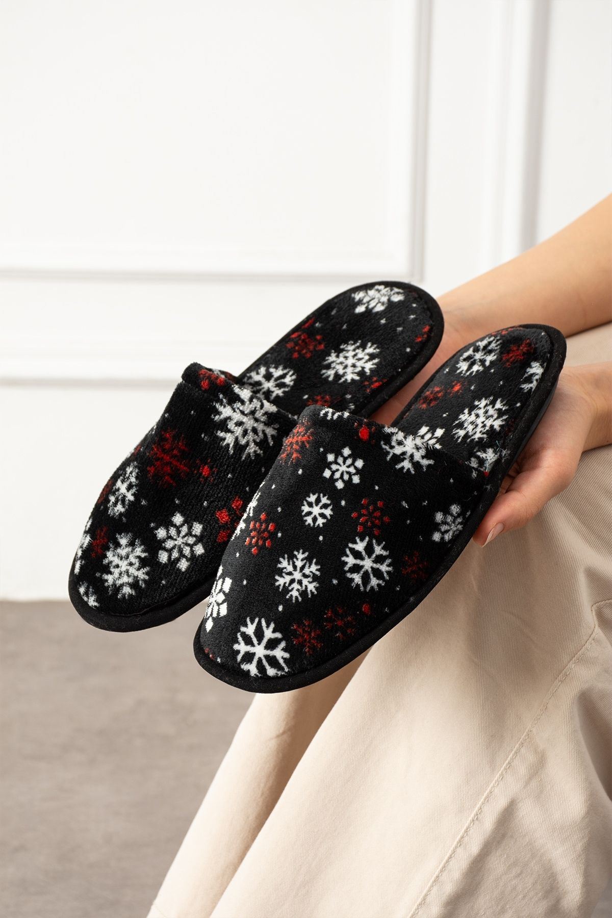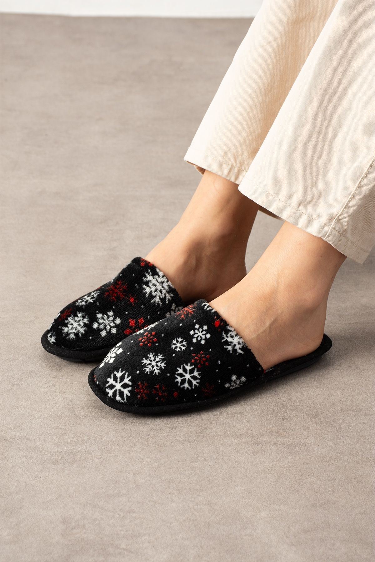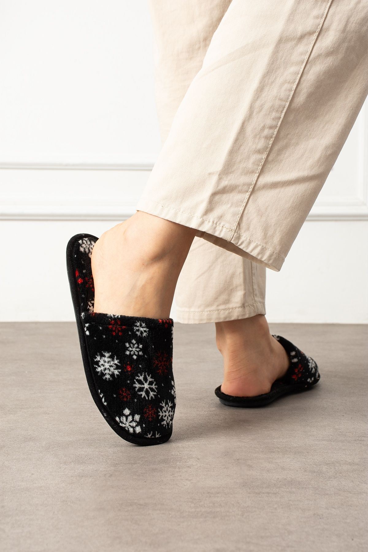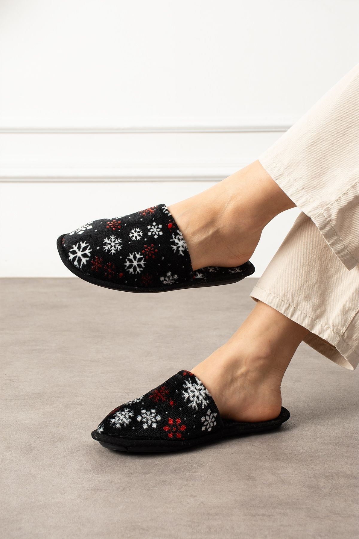 Alice Siyah Kar Tanesi Baskı Desenli Önü Kapalı Ev Terliği
