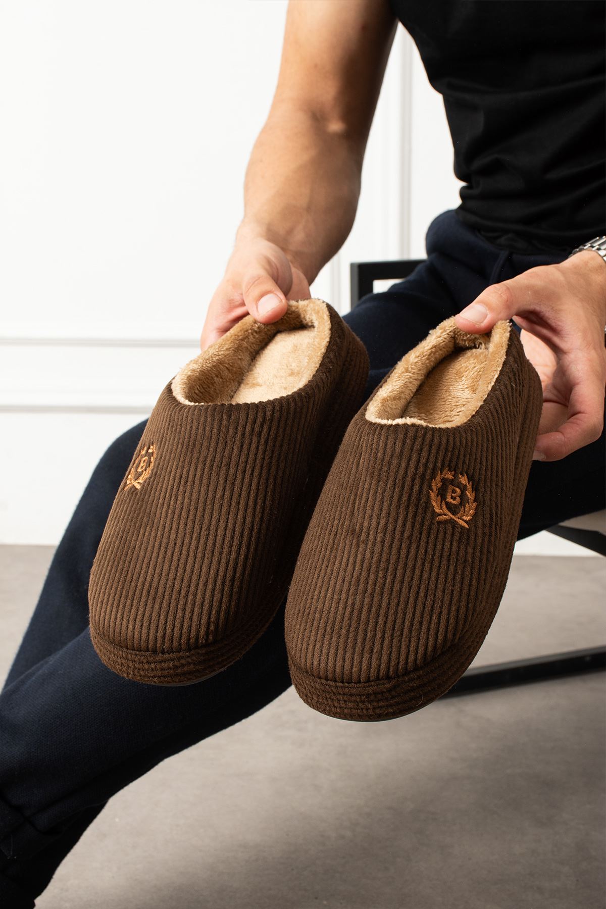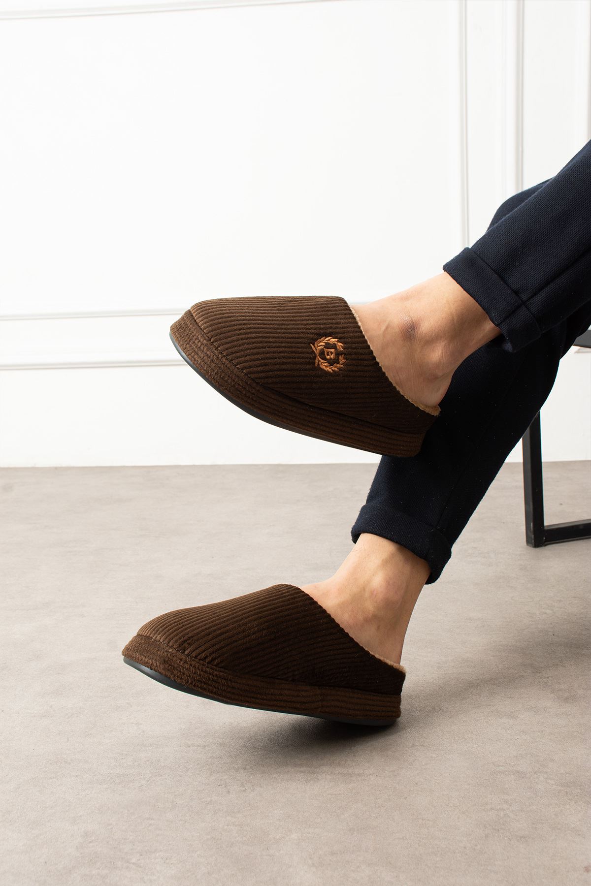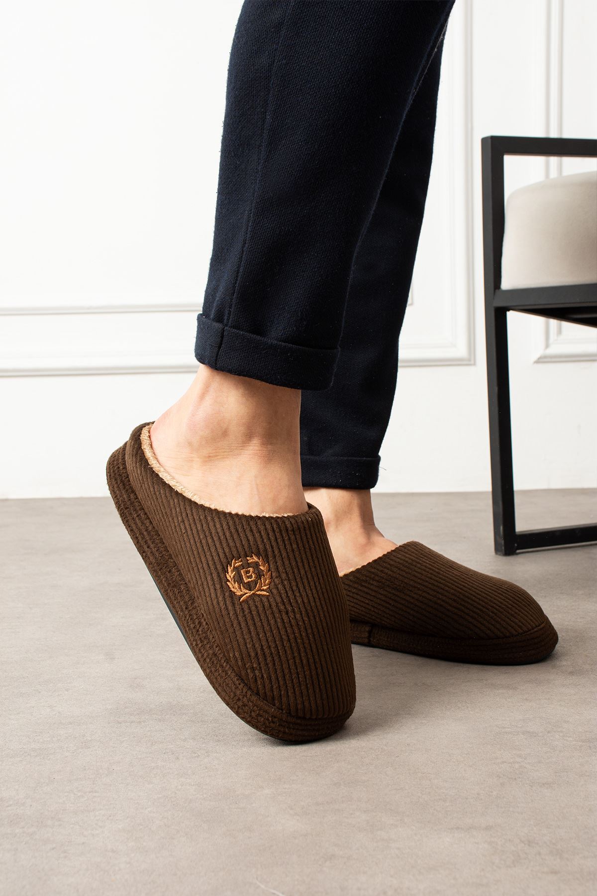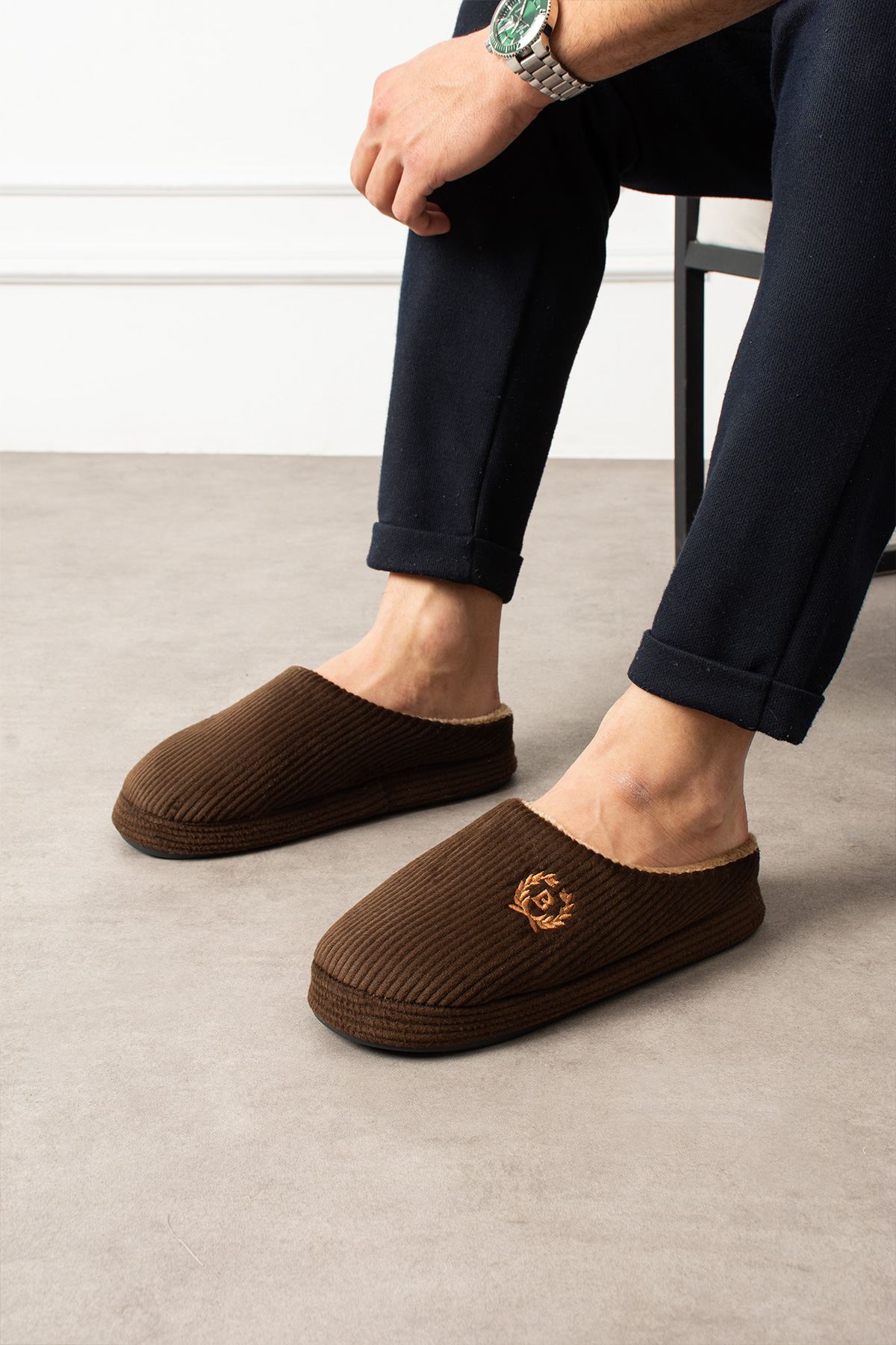 Atina Erkek Kahve Rengi Gri Çizgi Şerit Desenli Önü Kapalı Ev Terliği