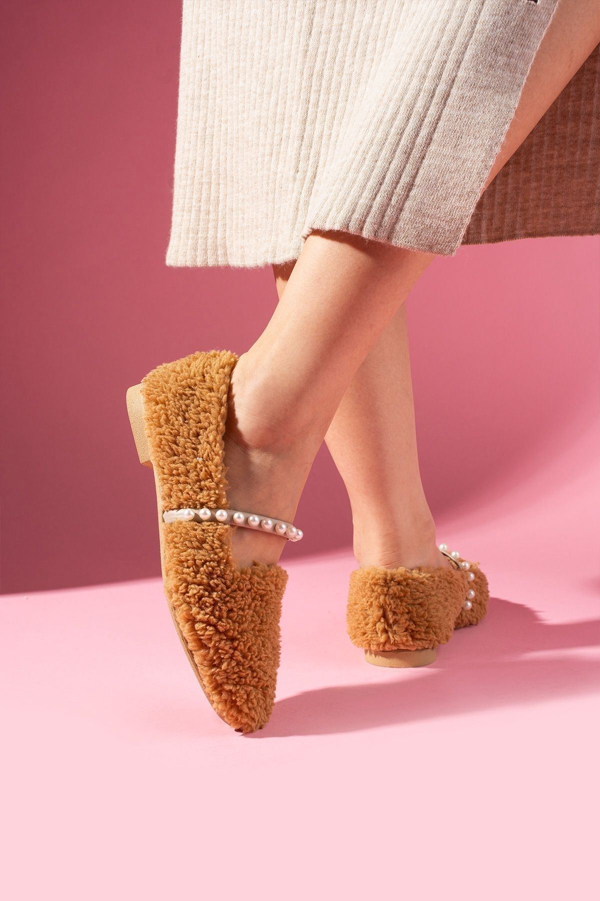 Livorno Taba Deri Detaylı Şerit Taş İşlemeli Önü Kapalı Ev Terliği