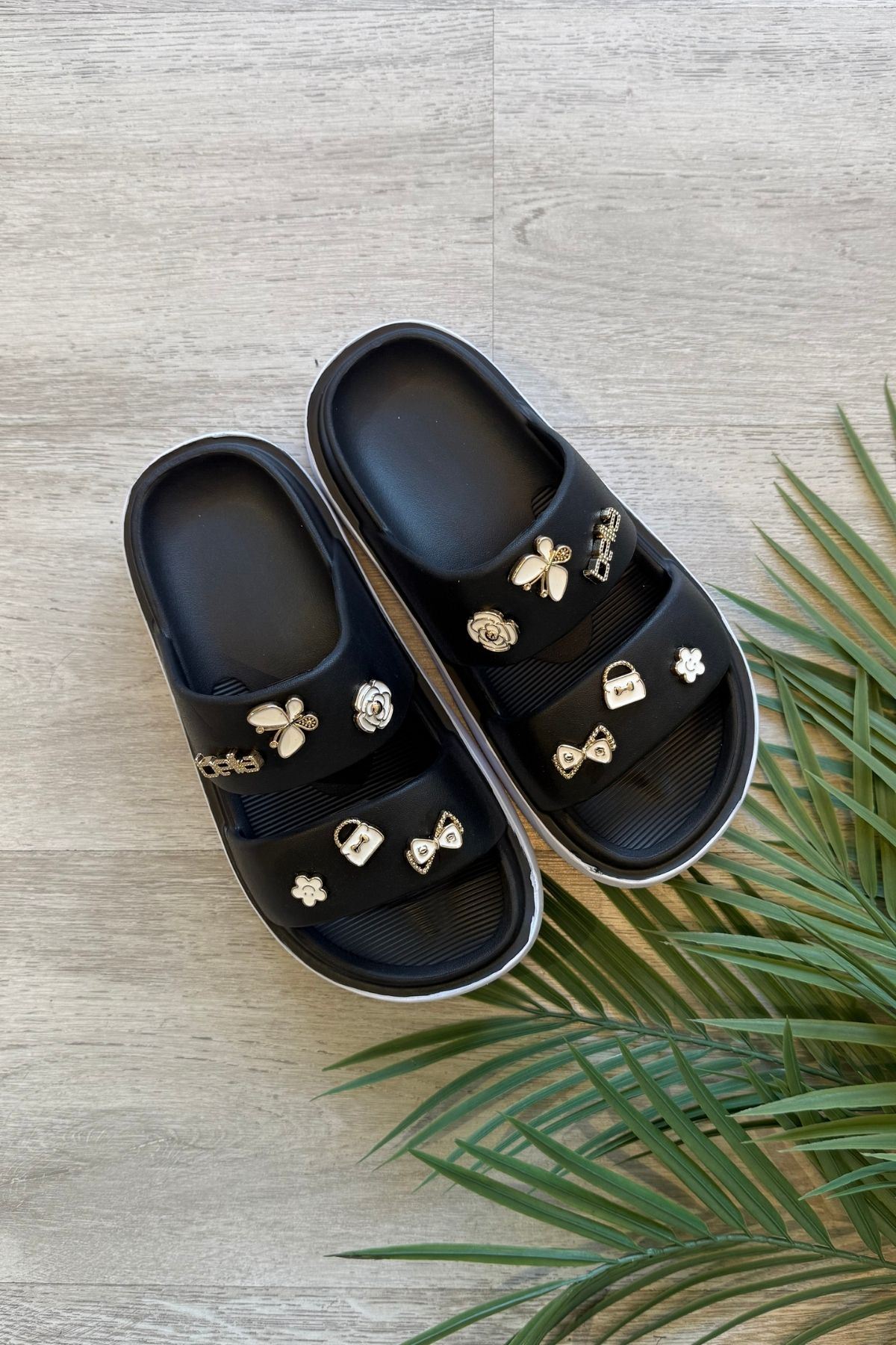 Belita Siyah Çift Bantlı Aksesuarlı Poliüretan Islak Zemin Terlik