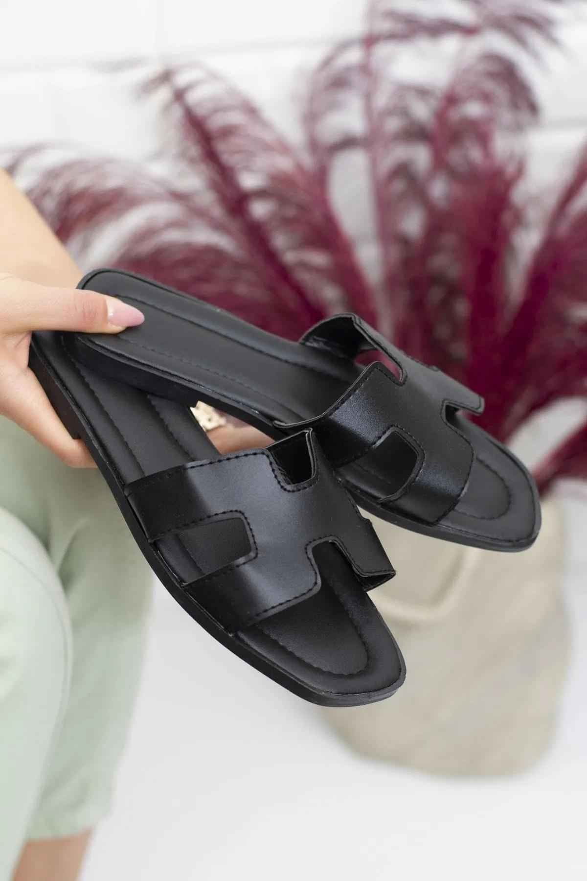 Catanya Siyah Kesik Kemerli Tek Bantlı Terlik