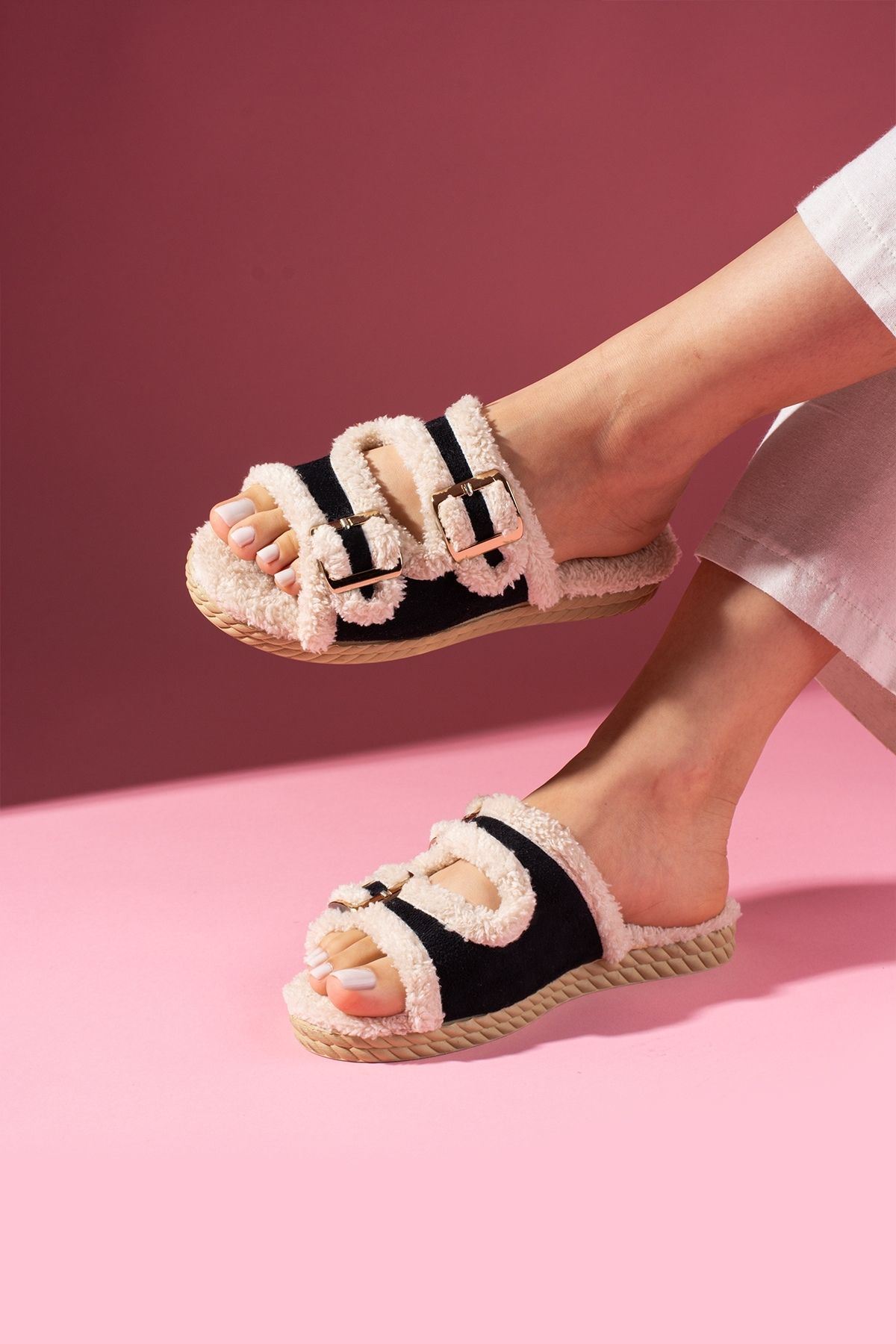 Damy Siyah Tokalı Çift Bantlı Peluş Detaylı Kadın Ev Terliği