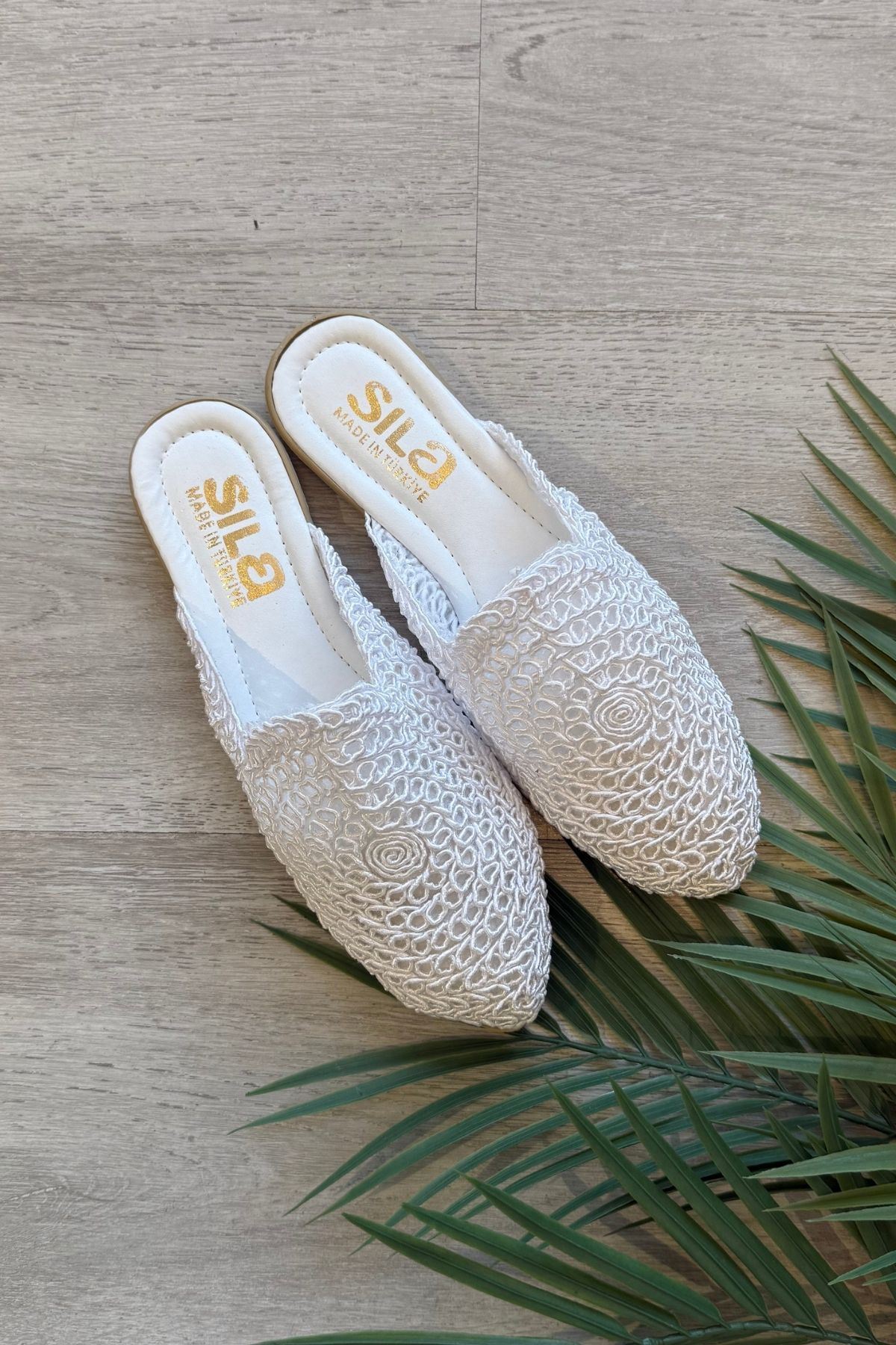Elaris Beyaz Dairesel Hasır İşlemeli Önü Kapalı Terlik