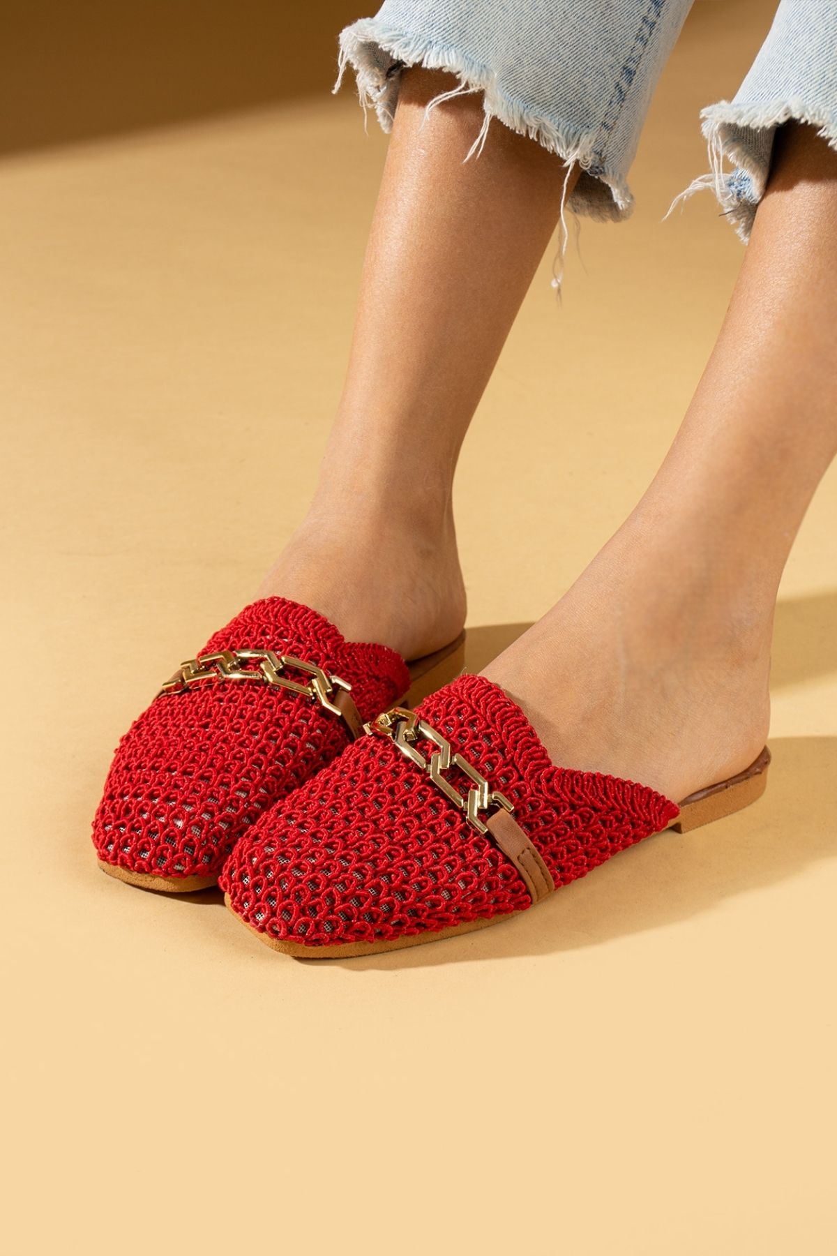 Estelya Kırmızı Zincir Kemerli İşleme Detaylı Önü Kapalı Terlik