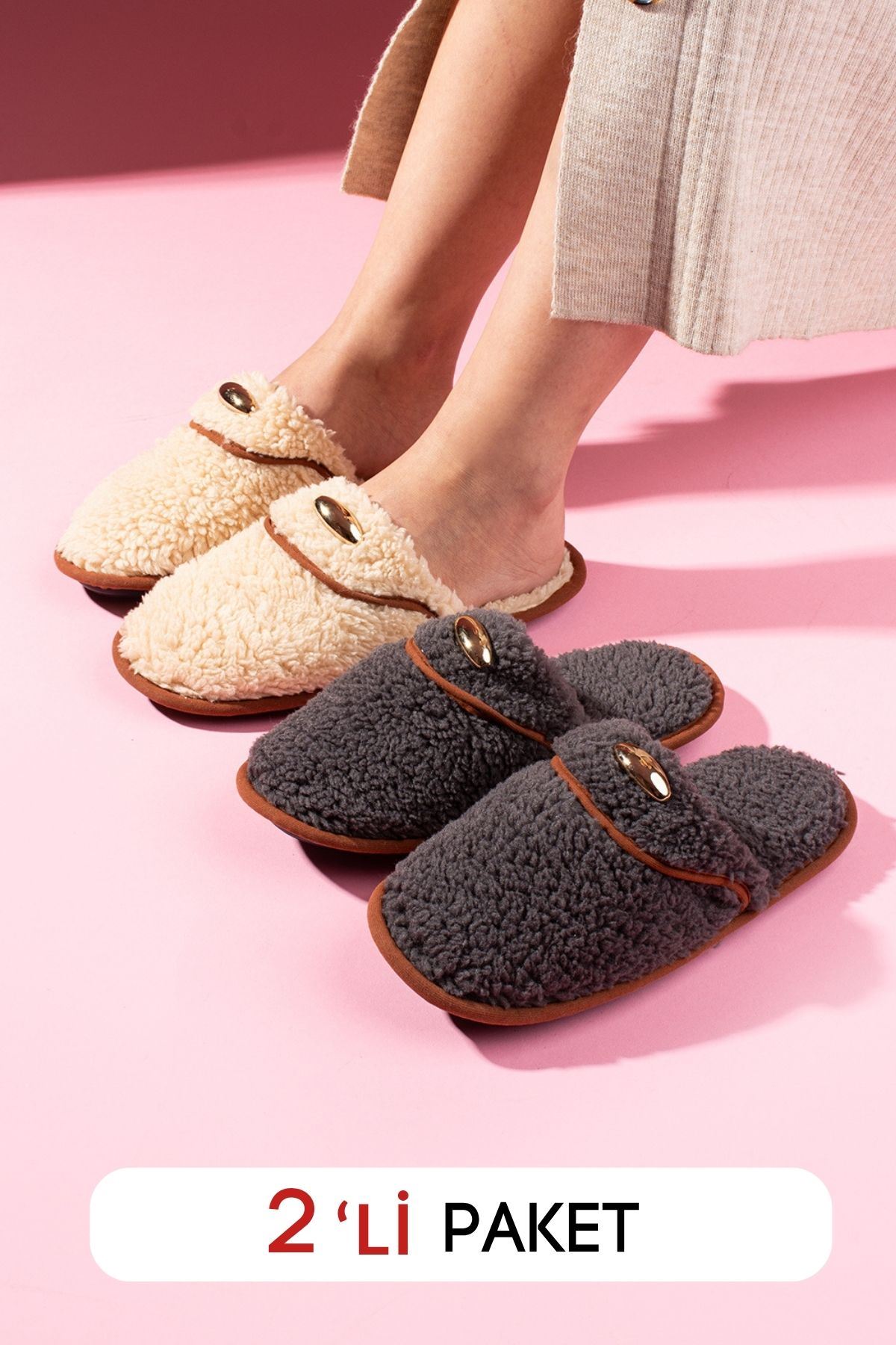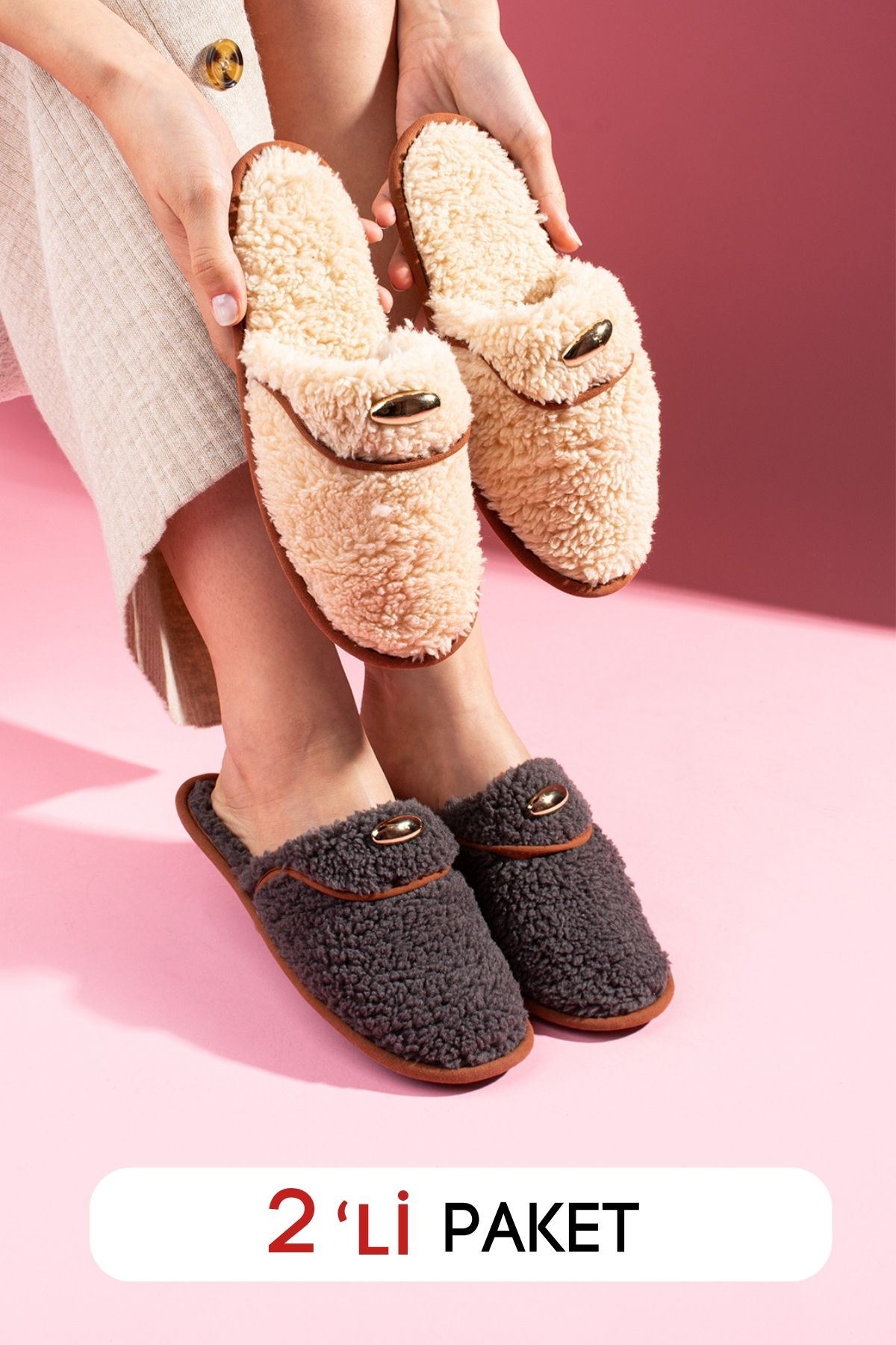 Evelis 2 li Paket Ev Terliği Çeyiz Terliği Kışlık Terlik Ses Yapmaz Hafif Taban Kapalı Kadın Ev Terliği