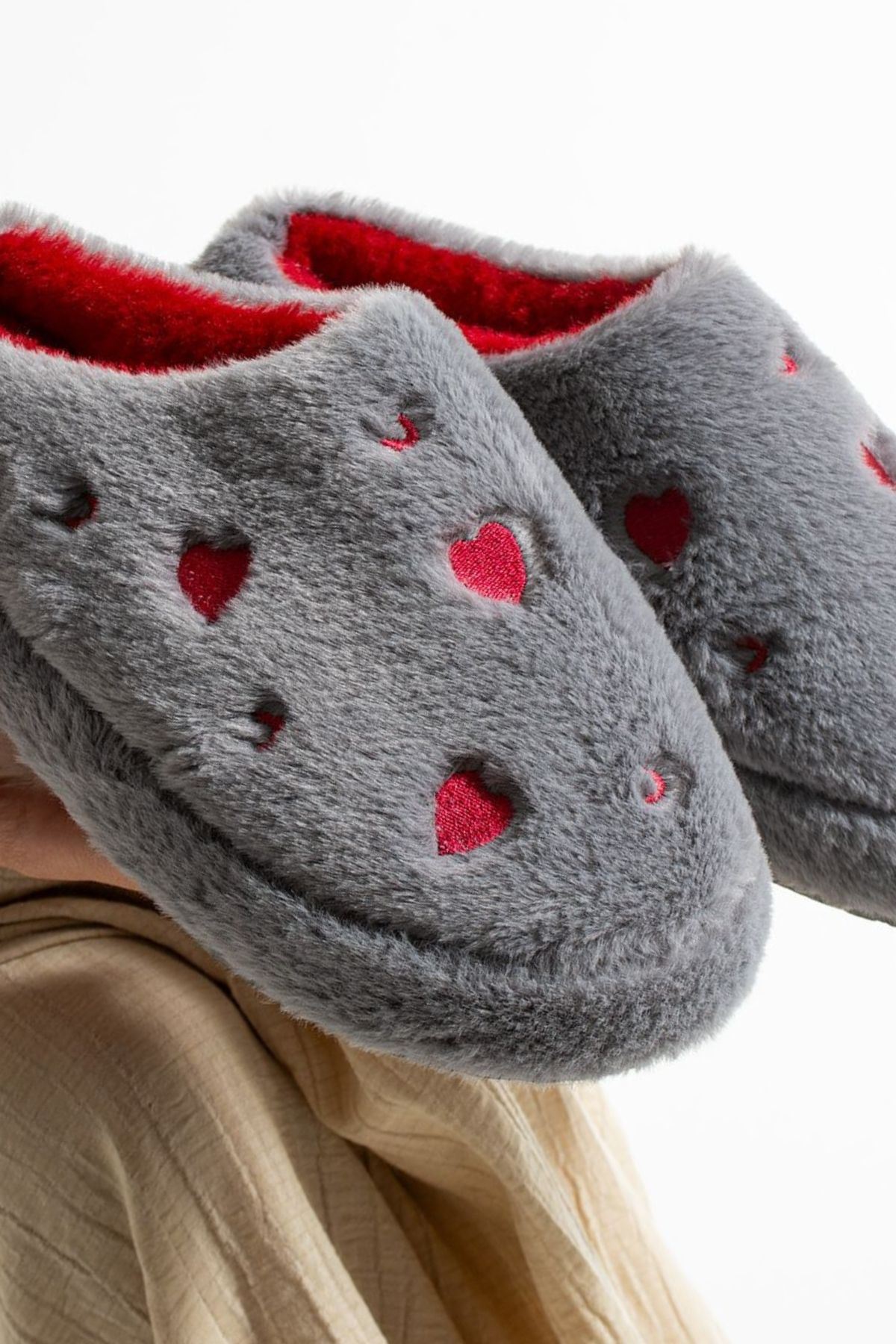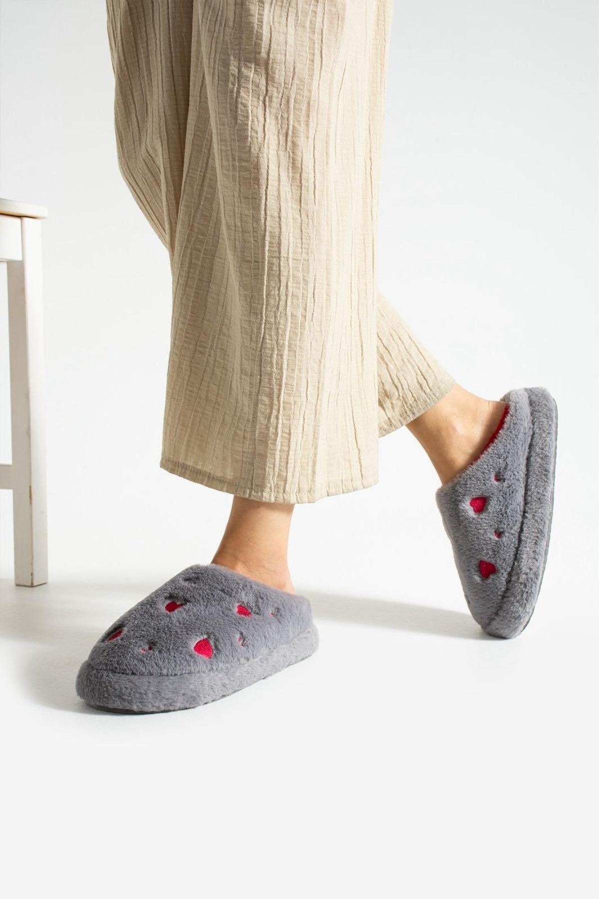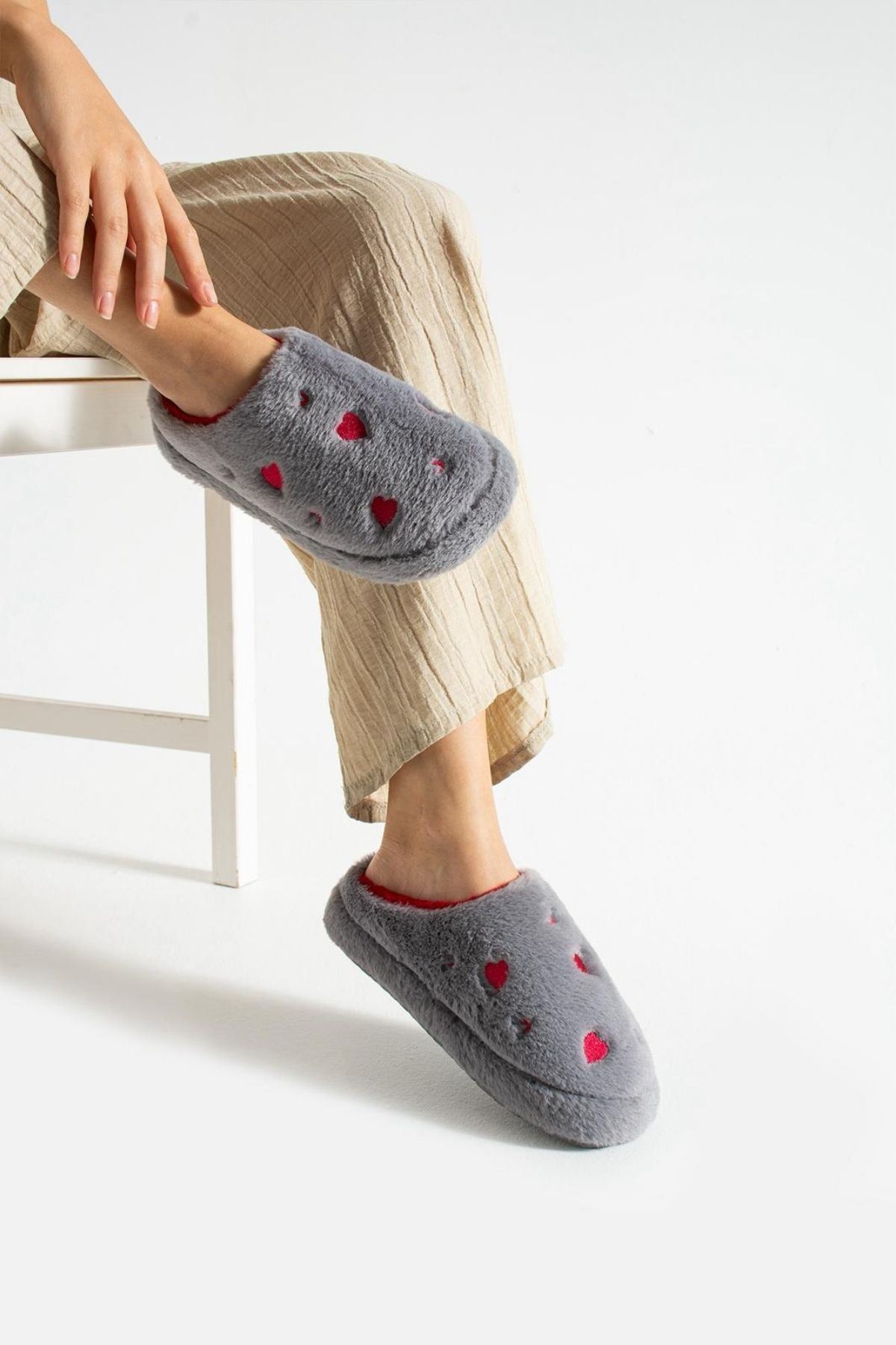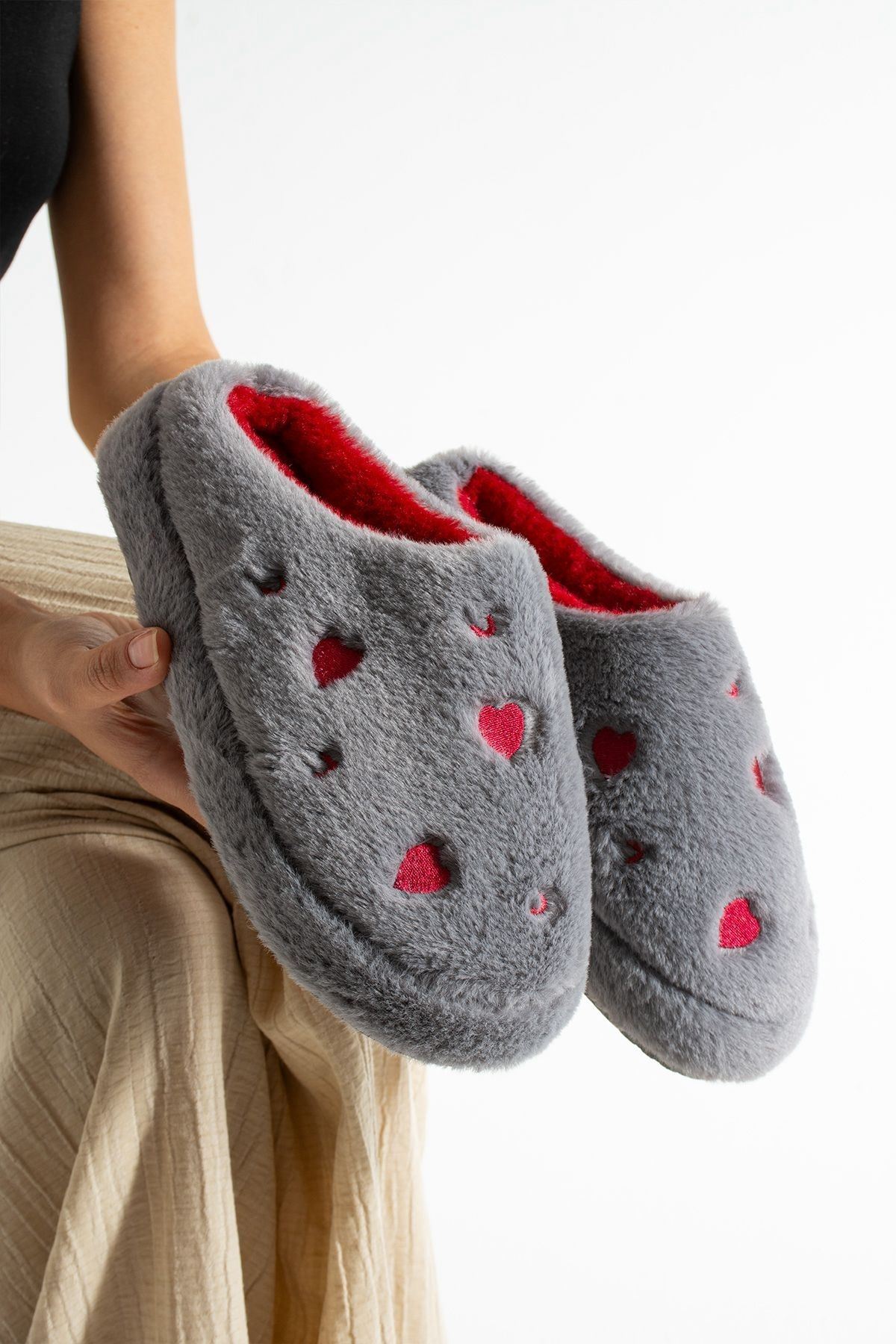 Evde aşkı ve sıcaklığı hissettiren terlik: HARTİN! Kalp desenli peluş kumaşıyla hem şık hem de eğlenceli bir görünüm sunar. İç yüzeyindeki yumuşacık astarı ve hafif EVA tabanı ile gün boyu konfor sağlar. Hem kendiniz hem sevdikleriniz için harika bir hediye seçeneği.