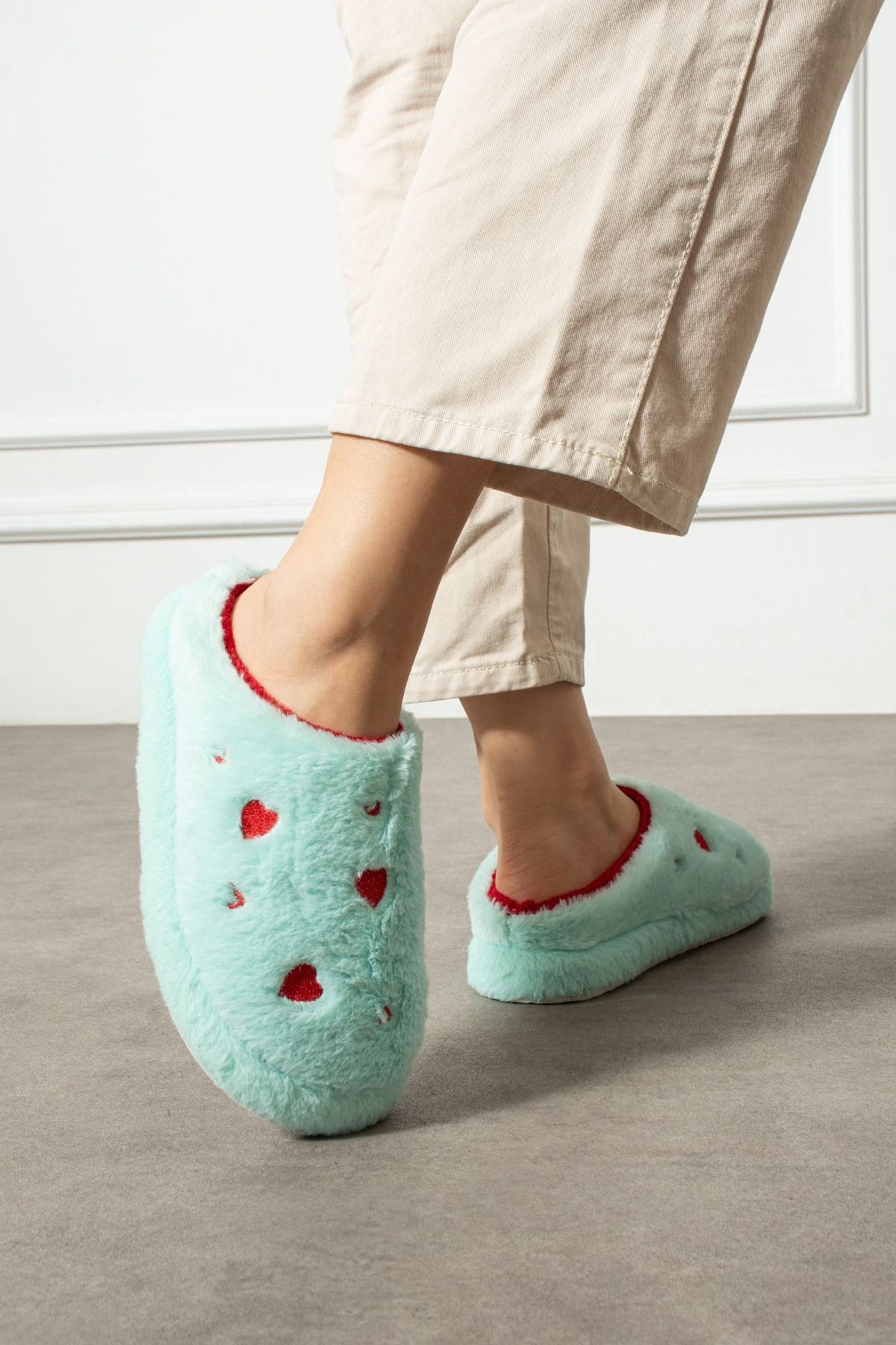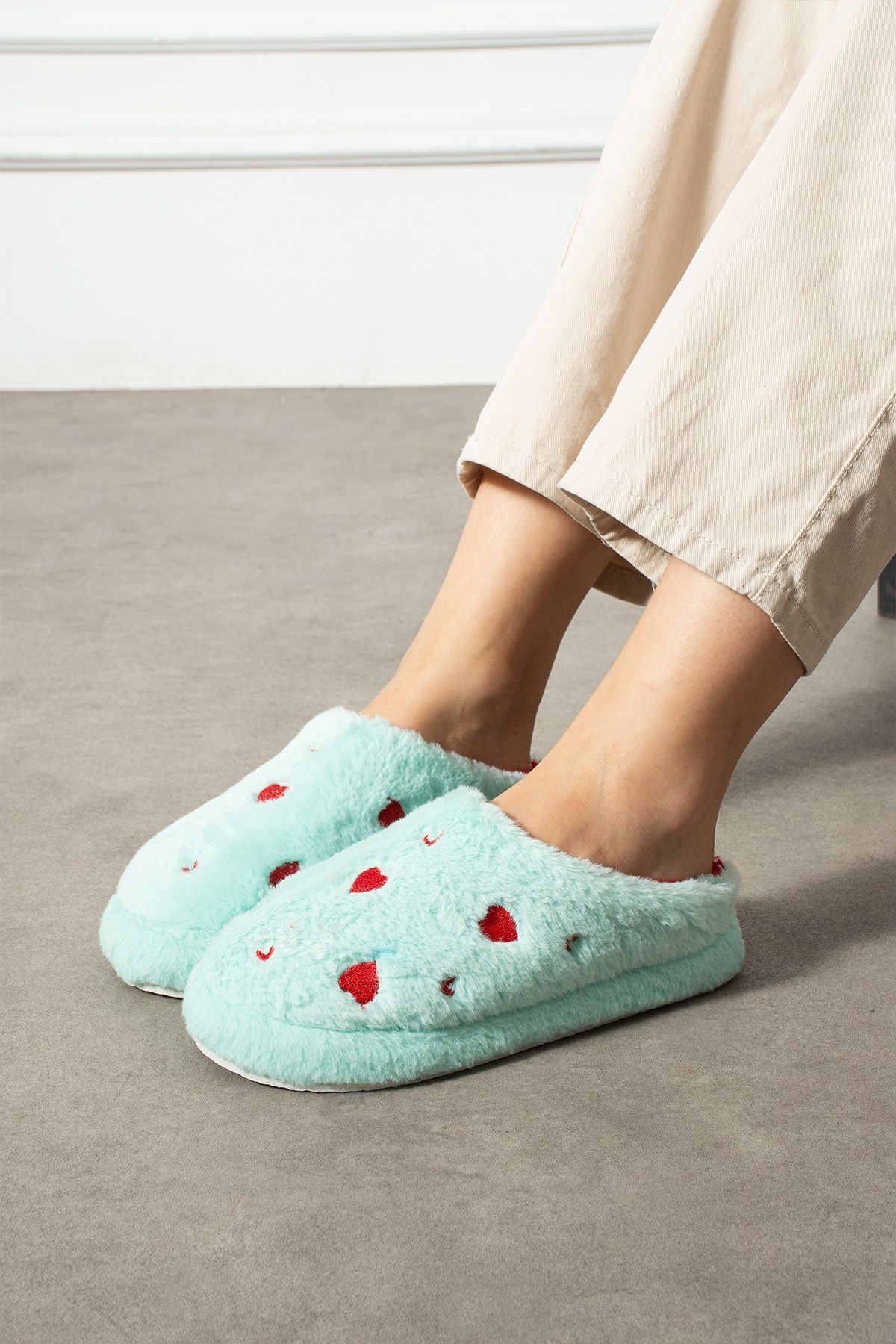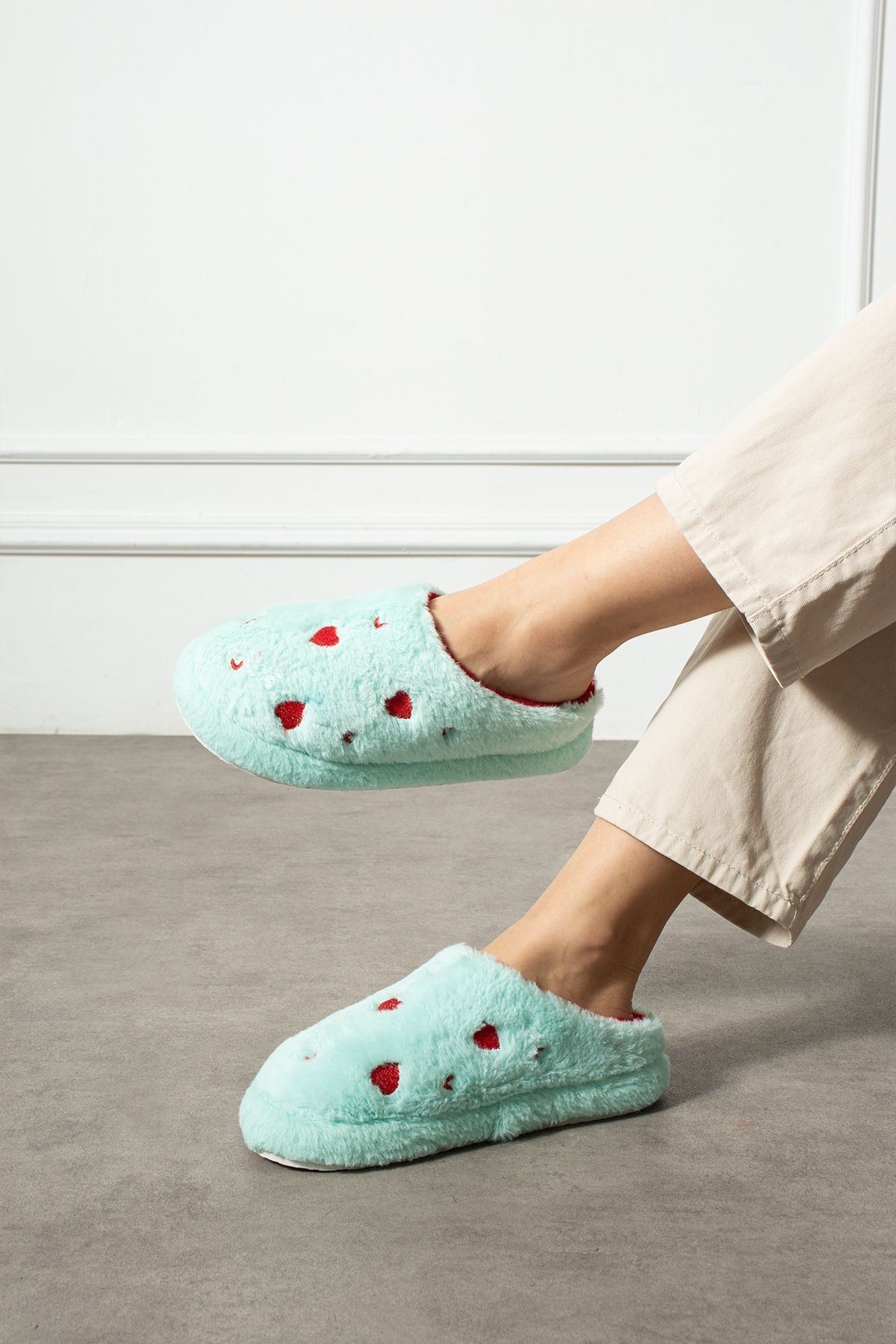 Evde aşkı ve sıcaklığı hissettiren terlik: HARTİN! Kalp desenli peluş kumaşıyla hem şık hem de eğlenceli bir görünüm sunar. İç yüzeyindeki yumuşacık astarı ve hafif EVA tabanı ile gün boyu konfor sağlar. Hem kendiniz hem sevdikleriniz için harika bir hediye seçeneği.