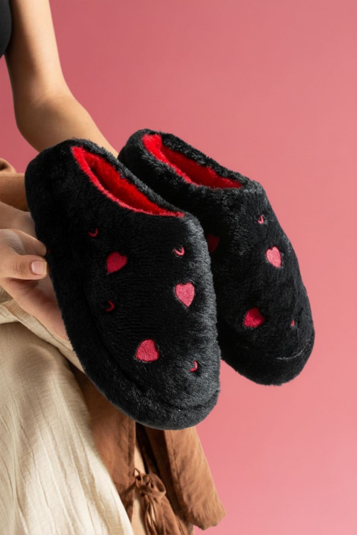 Evde aşkı ve sıcaklığı hissettiren terlik: HARTİN! Kalp desenli peluş kumaşıyla hem şık hem de eğlenceli bir görünüm sunar. İç yüzeyindeki yumuşacık astarı ve hafif EVA tabanı ile gün boyu konfor sağlar. Hem kendiniz hem sevdikleriniz için harika bir hediye seçeneği.