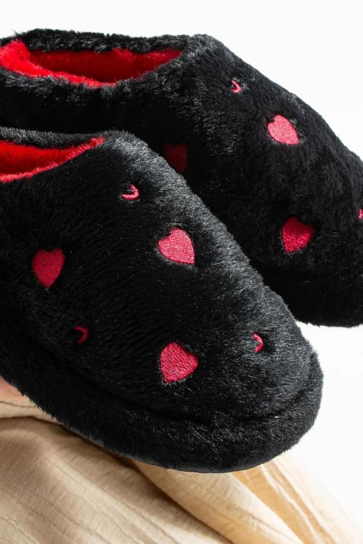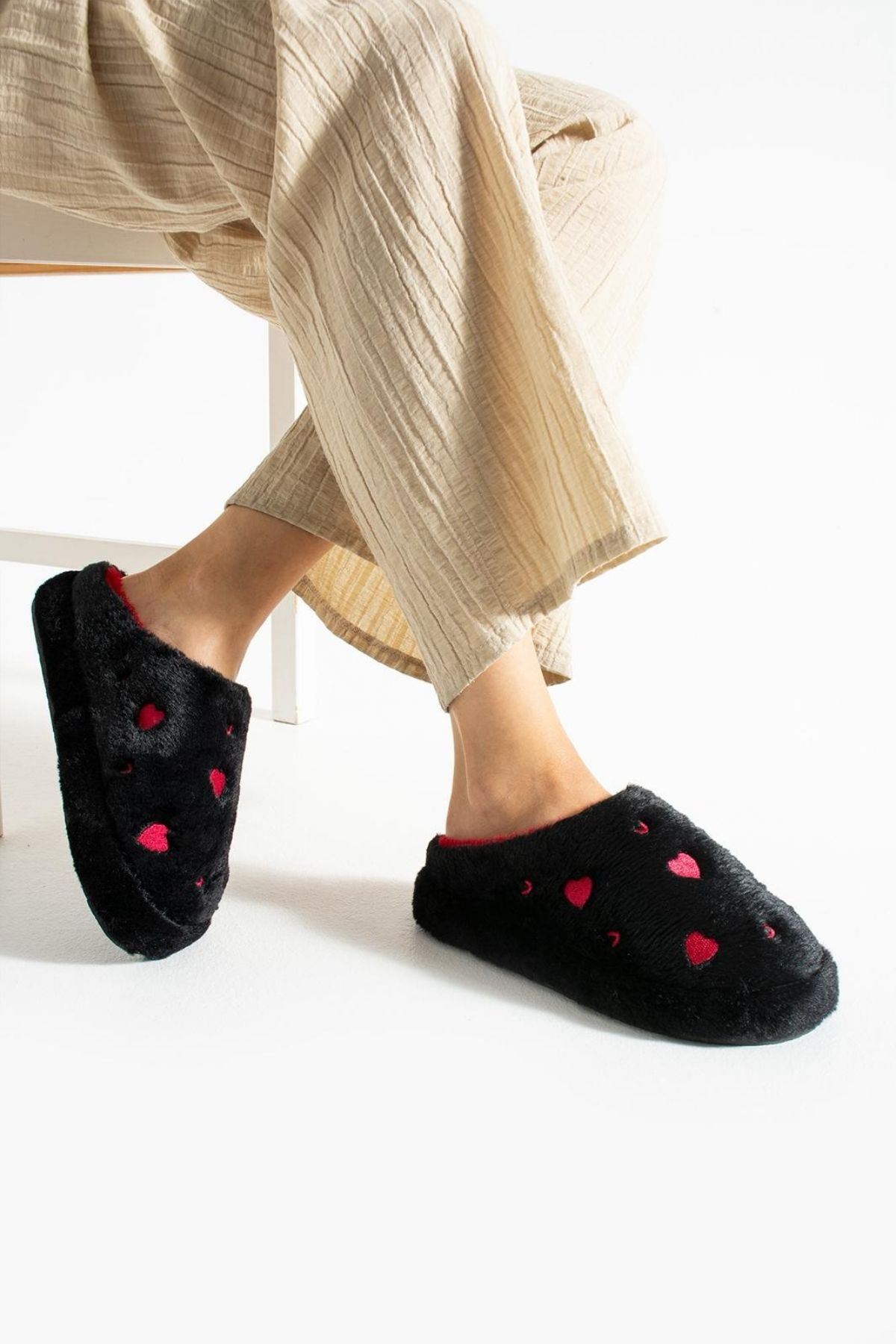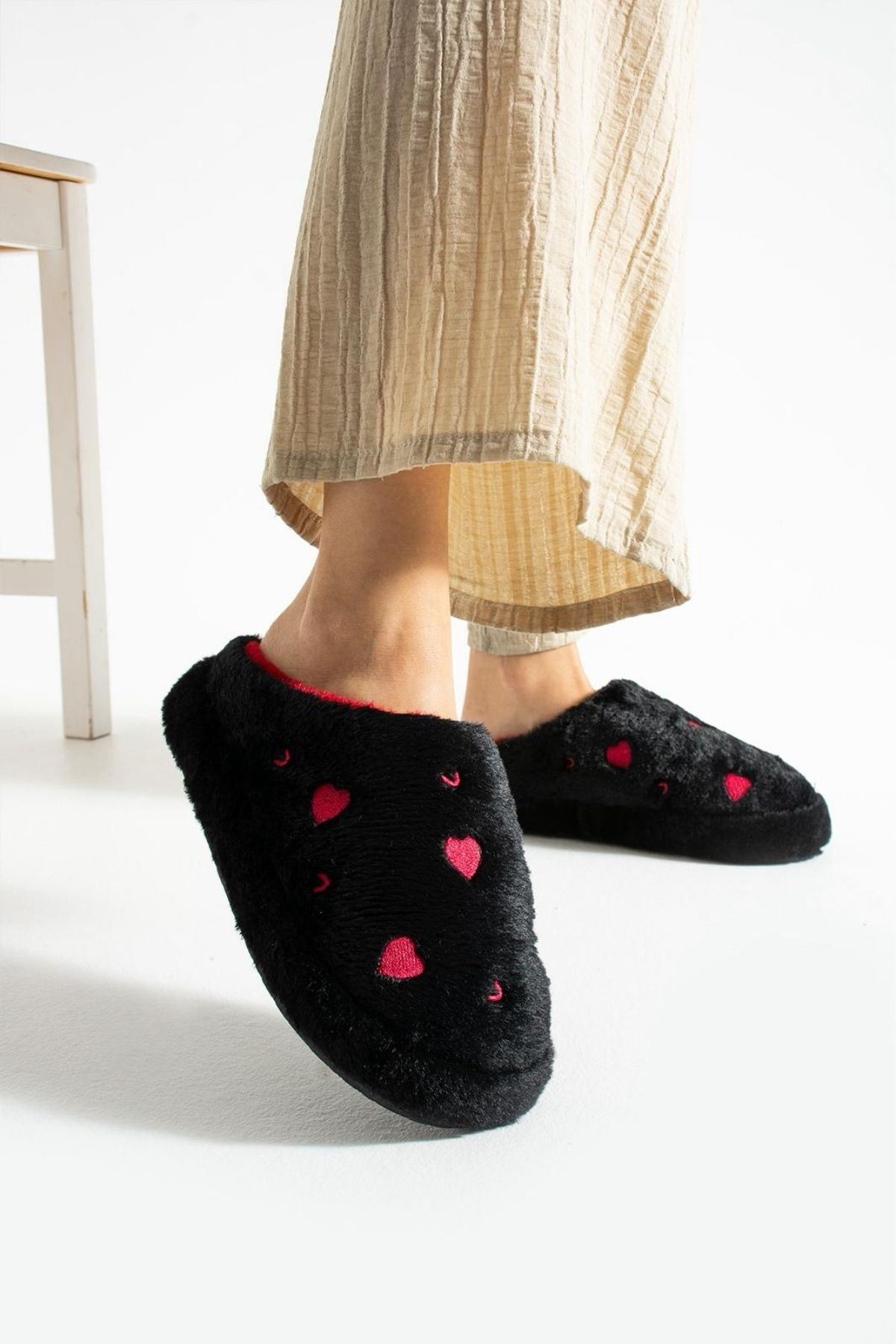 Hartin Siyah Kalp Nakış Desenli Peluş Kadın Sessiz Taban Ev Terliği