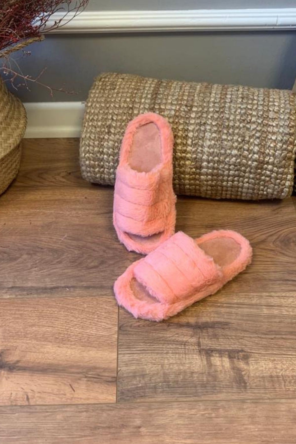 Jessica Pembe Tek Bantlı Tüylü Önü Açık Ev Terliği