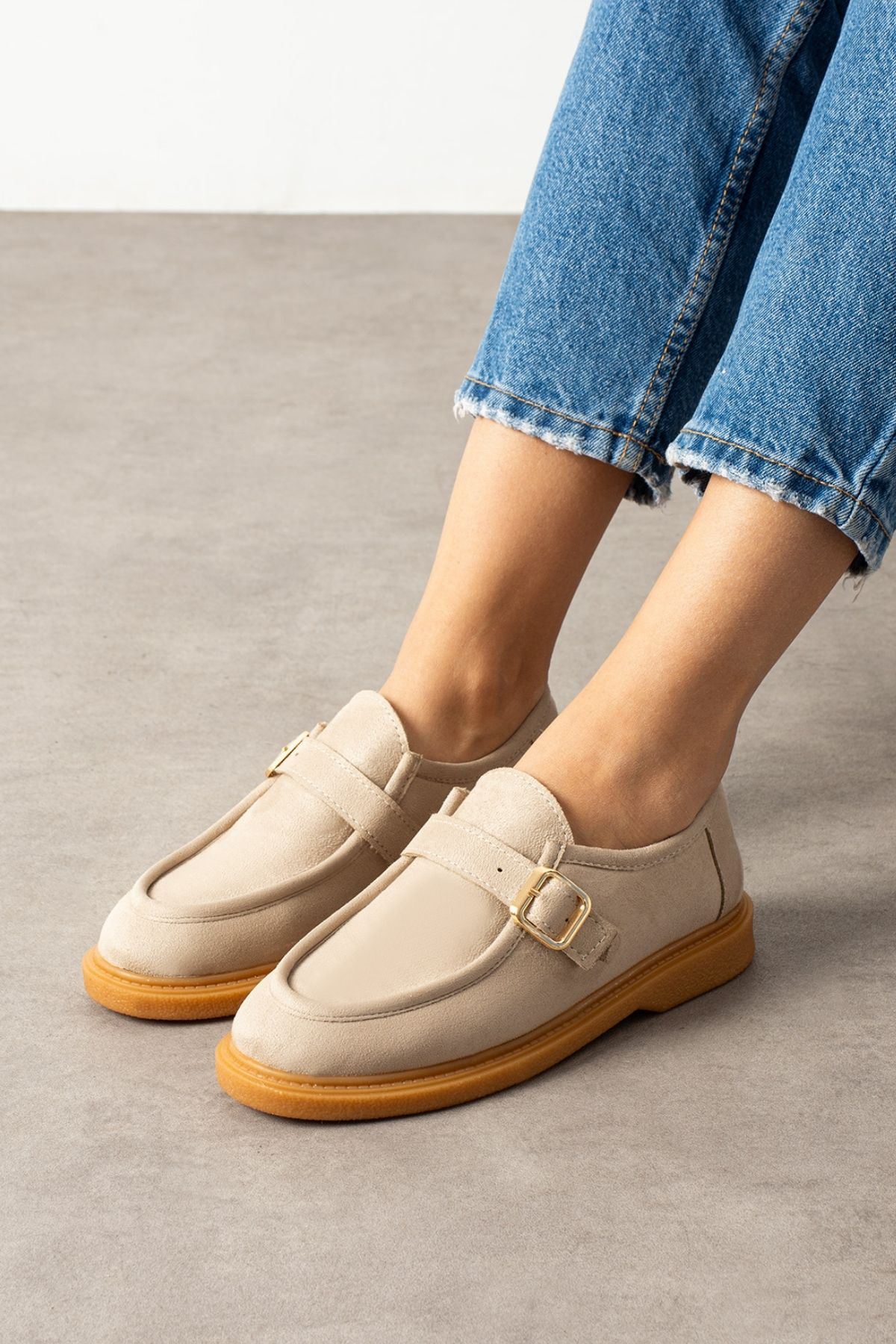 Loriva Bej Süet Kemerli Gold Tokalı Kalın Saraç Detaylı Loafer Babet Günlük Ayakkabı