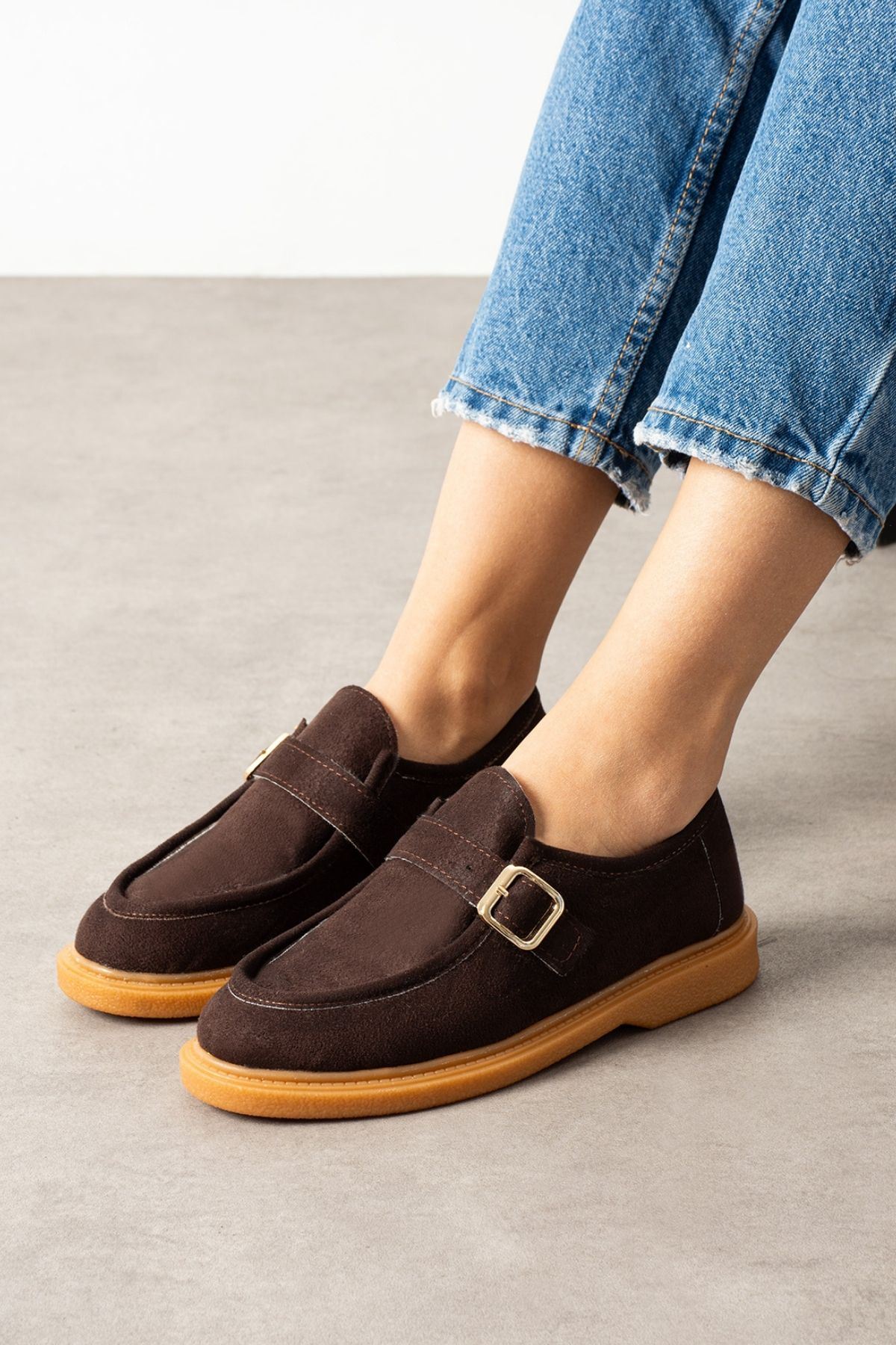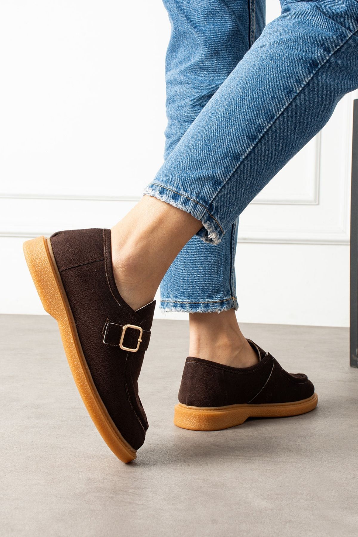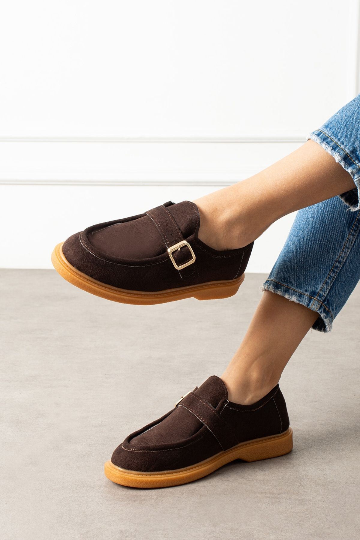 Loriva Kahverengi Süet Kemerli Gold Tokalı Kalın Saraç Detaylı Loafer Babet Günlük Ayakkabı