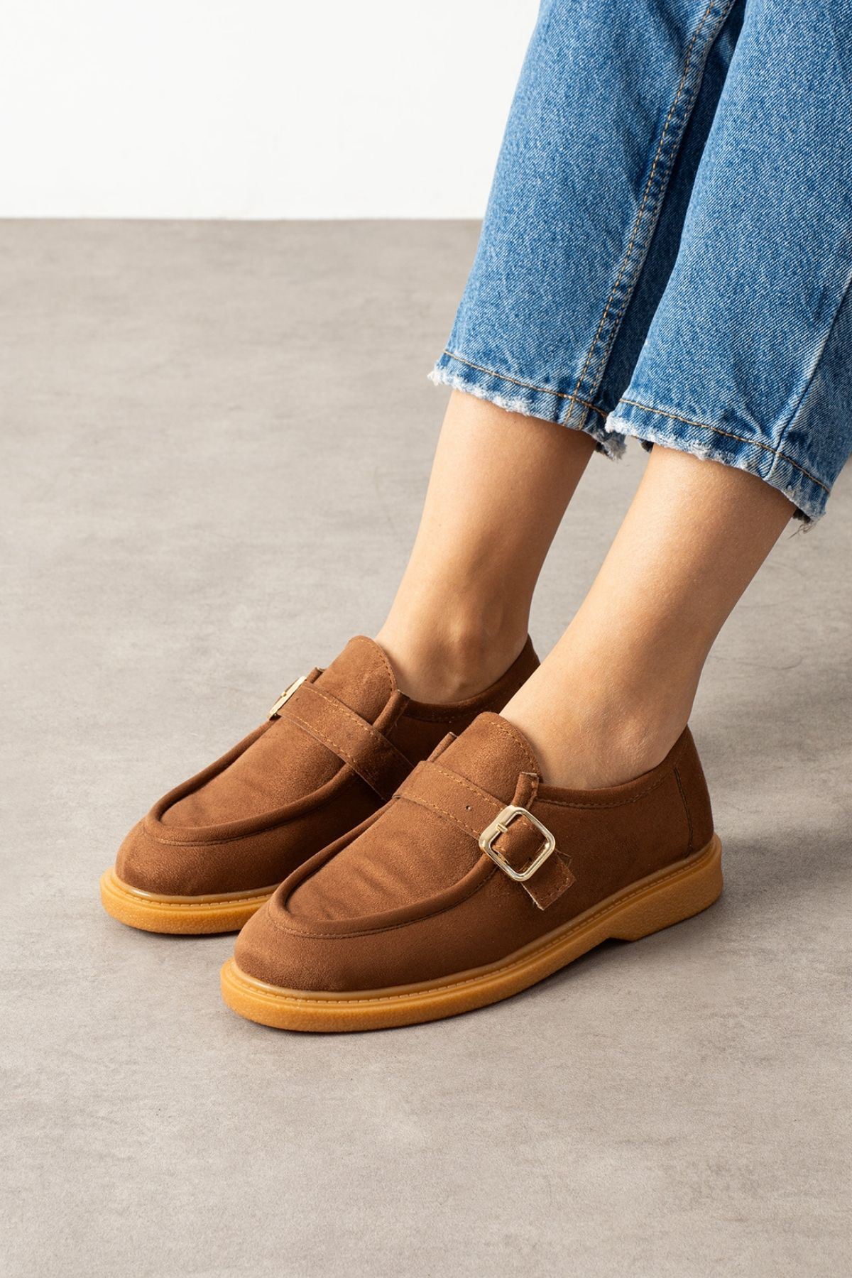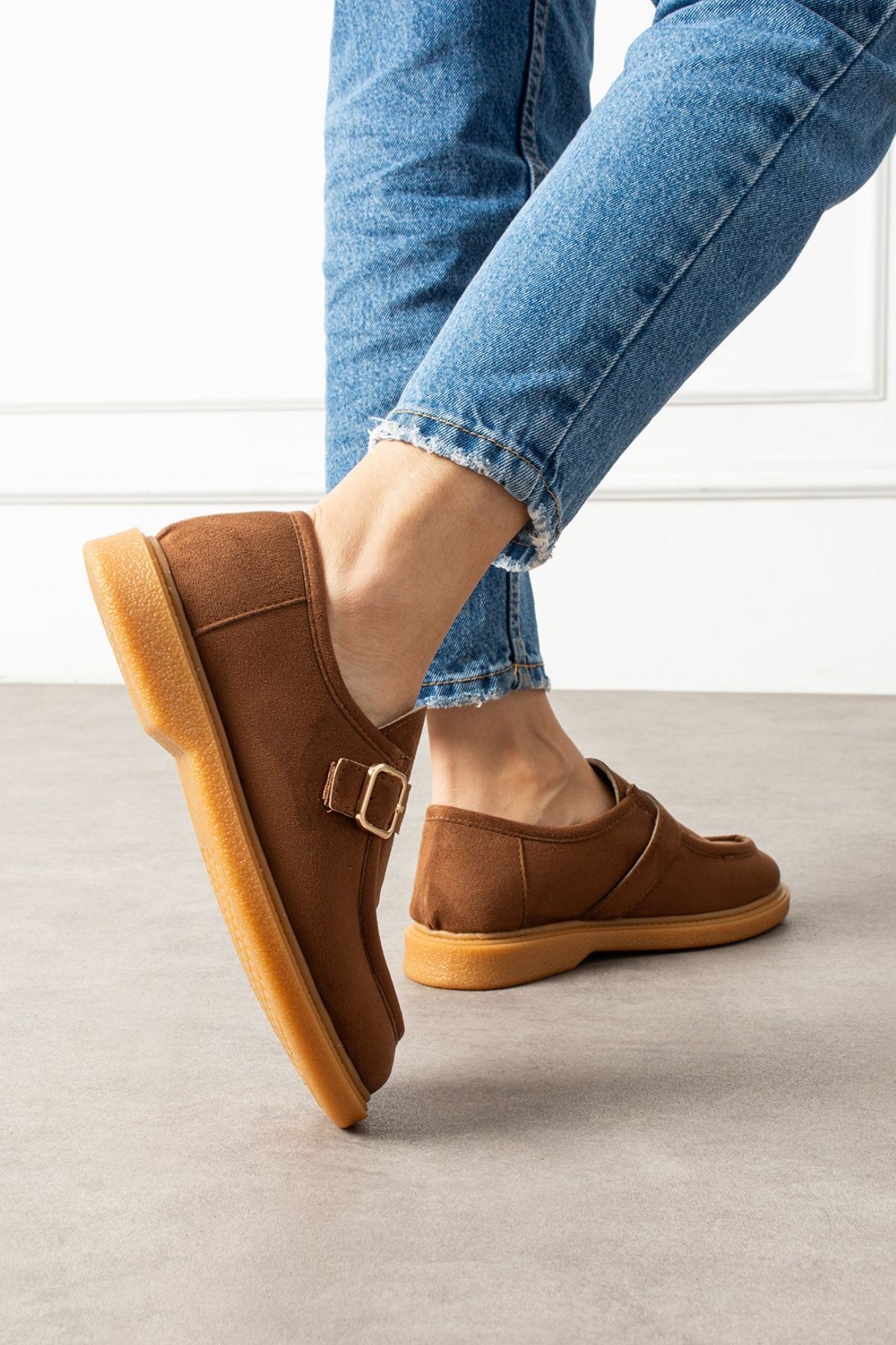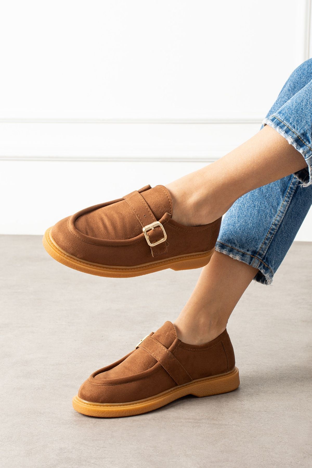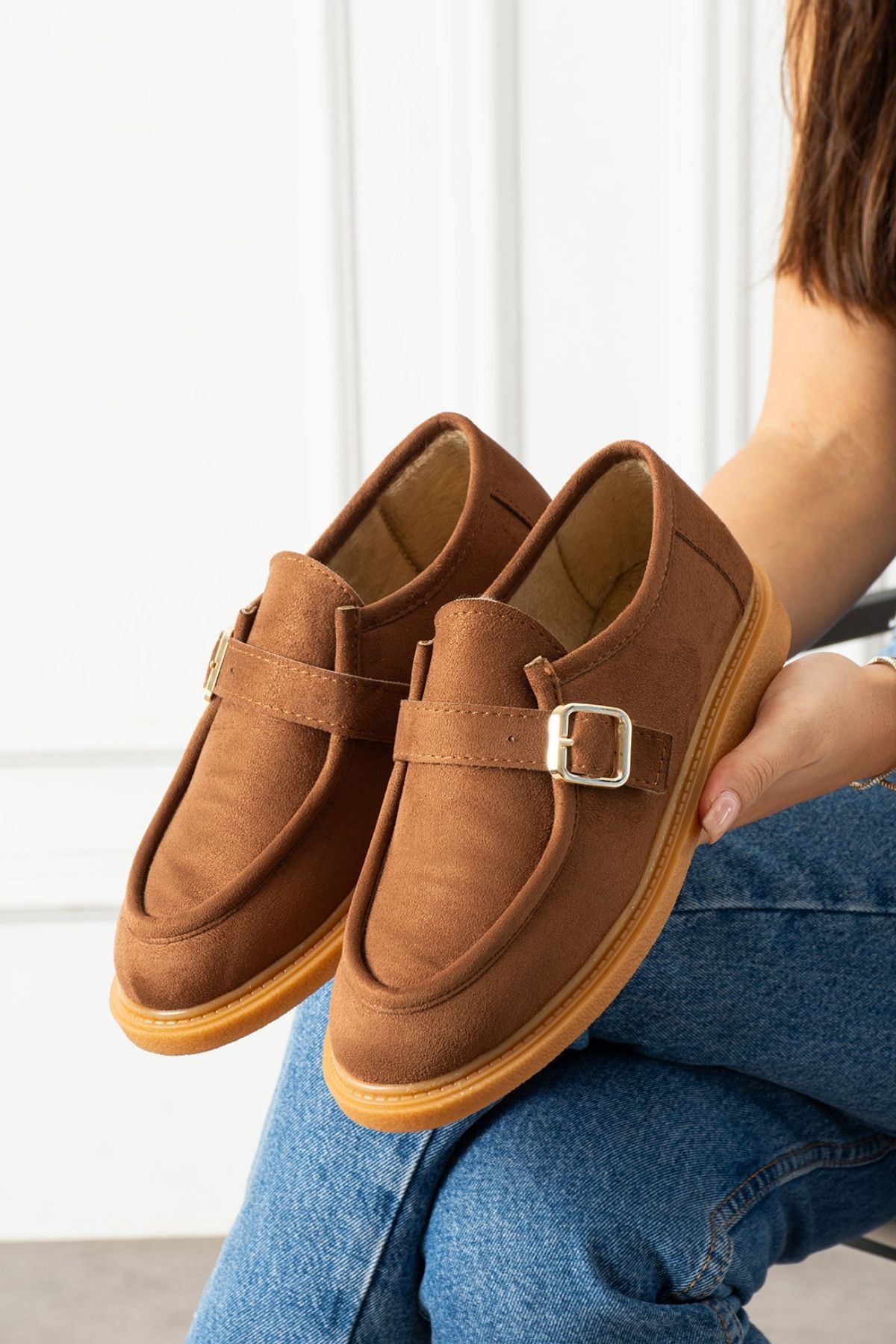 Loriva Taba Süet Kemerli Gold Tokalı Kalın Saraç Detaylı Loafer Babet Günlük Ayakkabı
