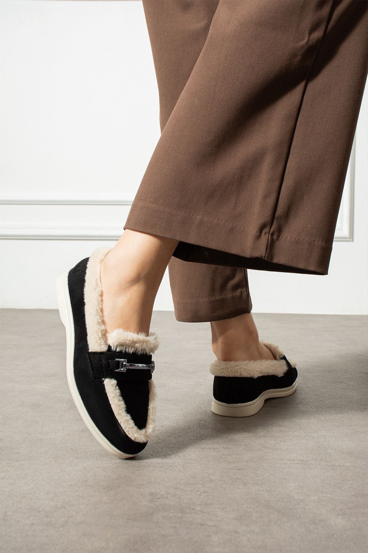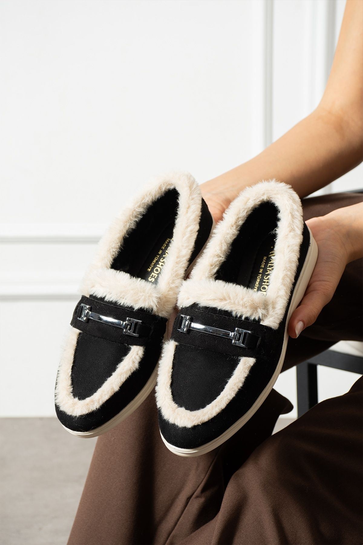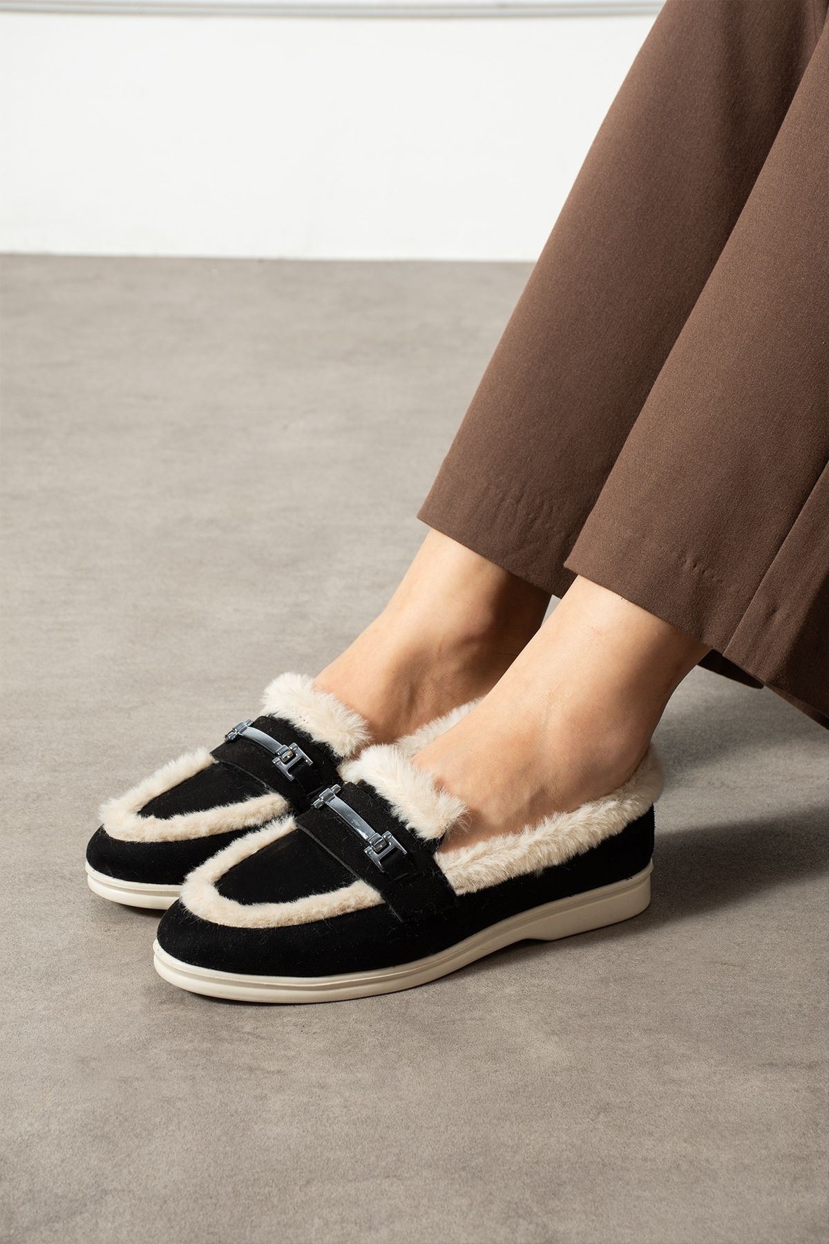 Lorven Siyah Bej Süet Tokalı Peluş Şerit Detaylı Loafer Babet Günlük Ayakkabı