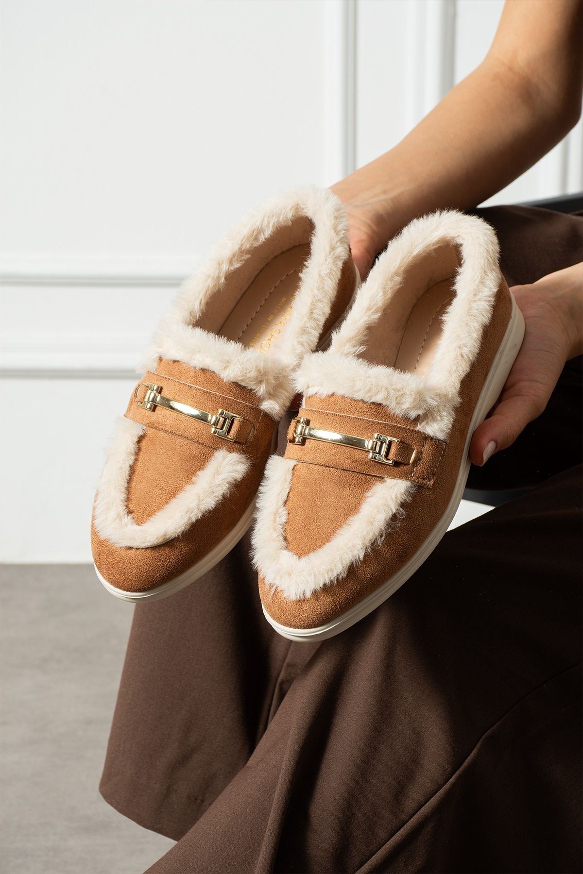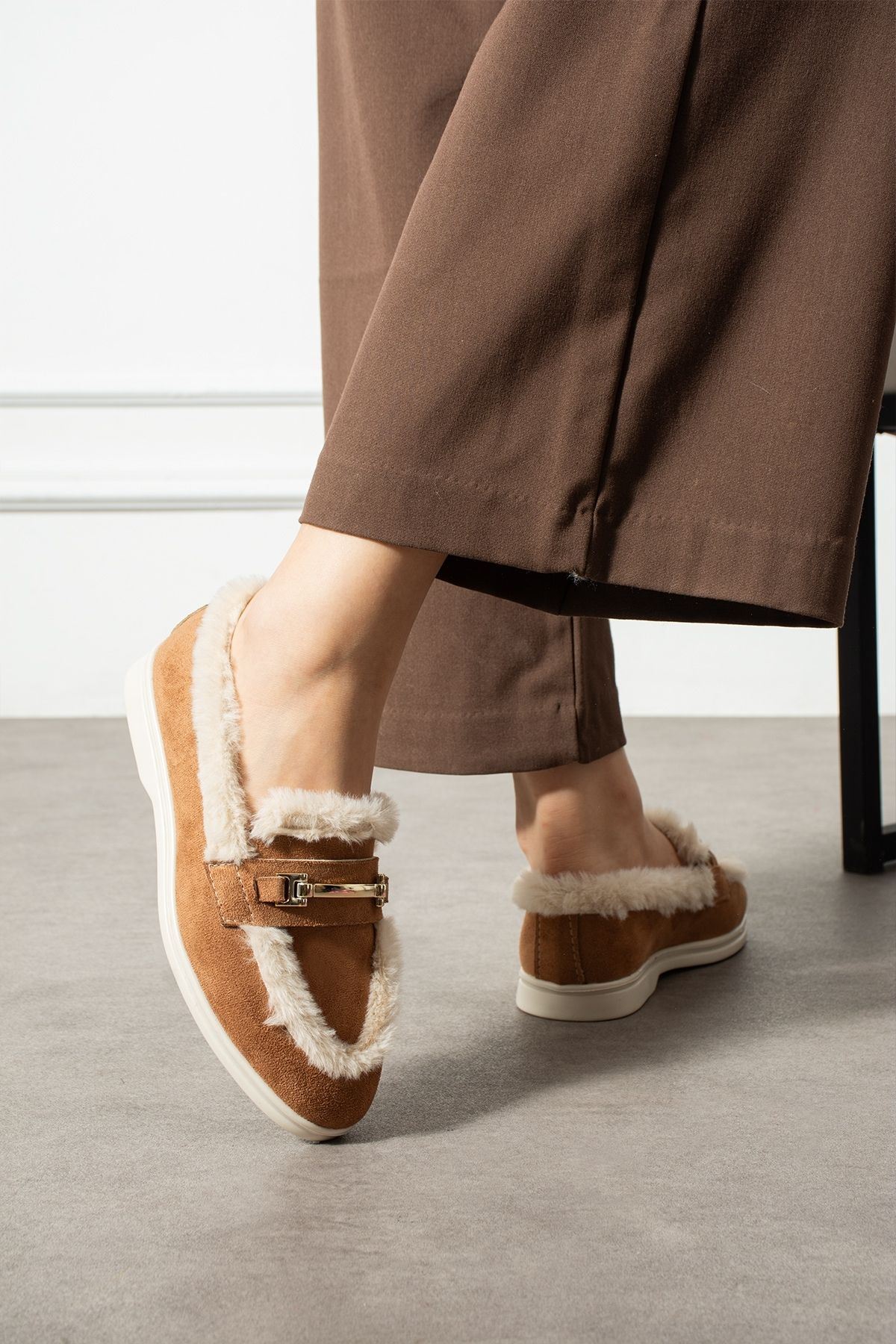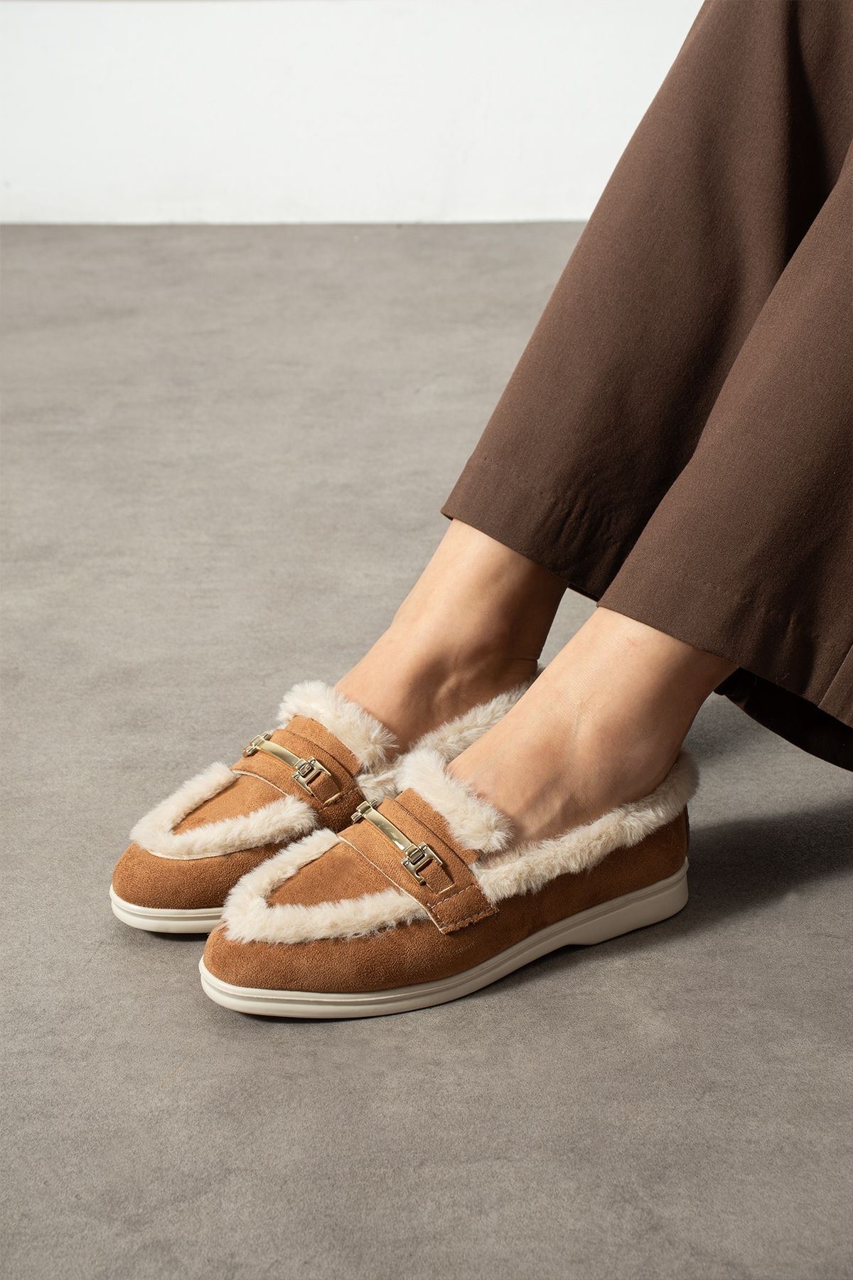 Lorven Taba Süet Tokalı Peluş Şerit Detaylı Loafer Babet Günlük Ayakkabı