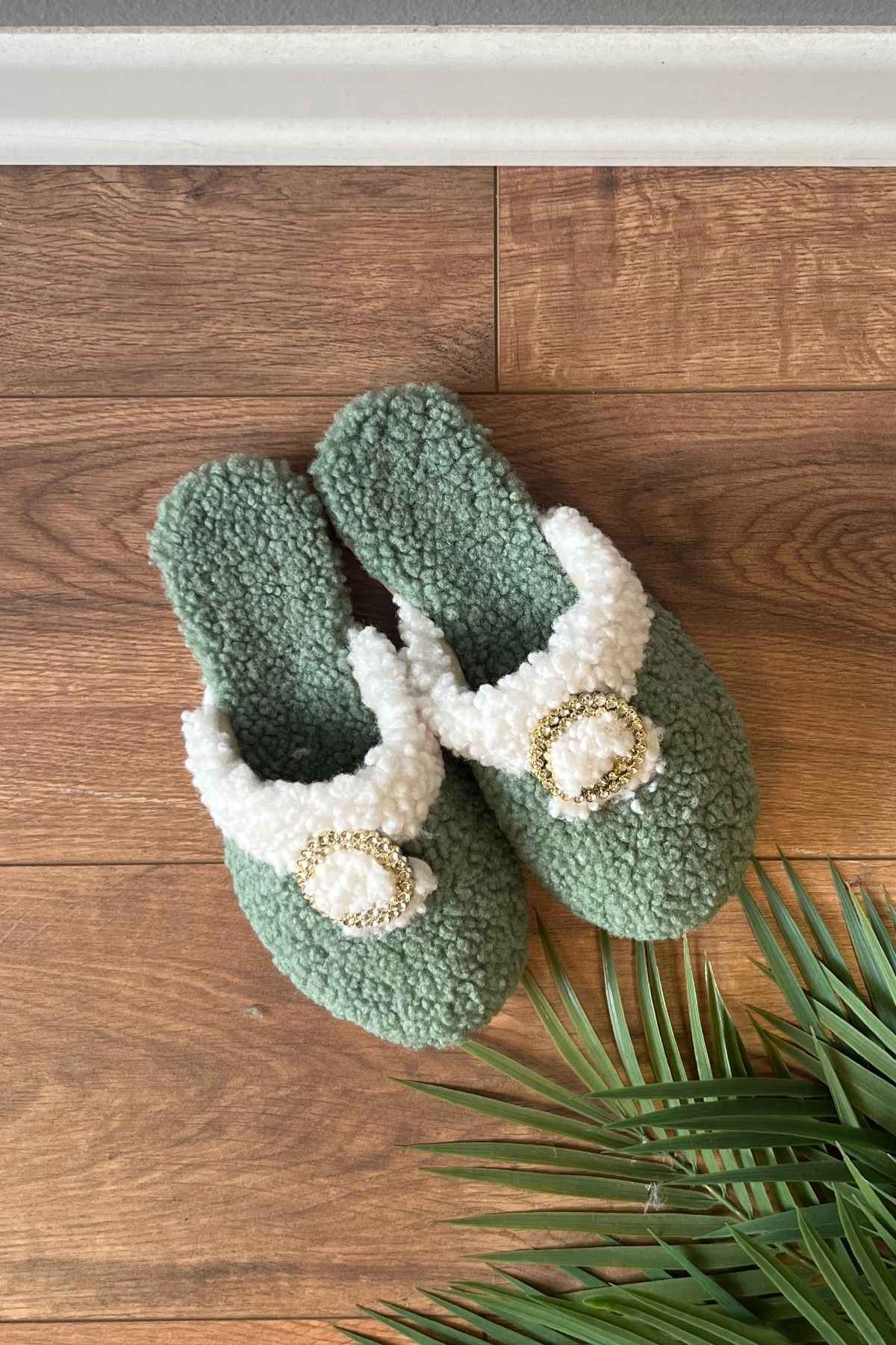Lowres Mint Yeşili Yuvarlak Gold Tokalı Tüylü Önü Kapalı Ev Terliği