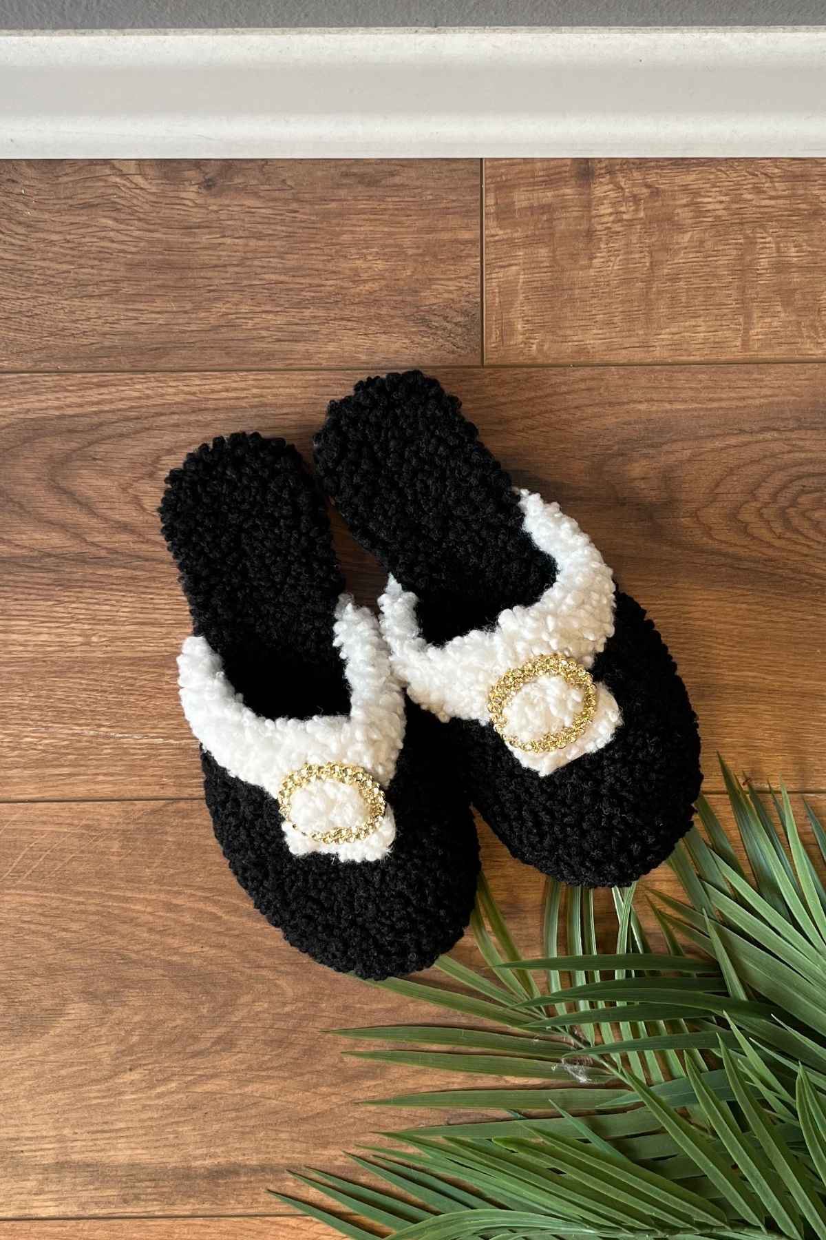Lowres Siyah Yuvarlak Gold Tokalı Tüylü Önü Kapalı Ev Terliği