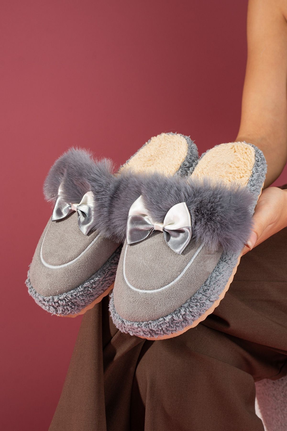 Lufina Gri Fiyonklu Kürk Yakalı Saraç Detaylı Sessiz Taban Ev Terliği