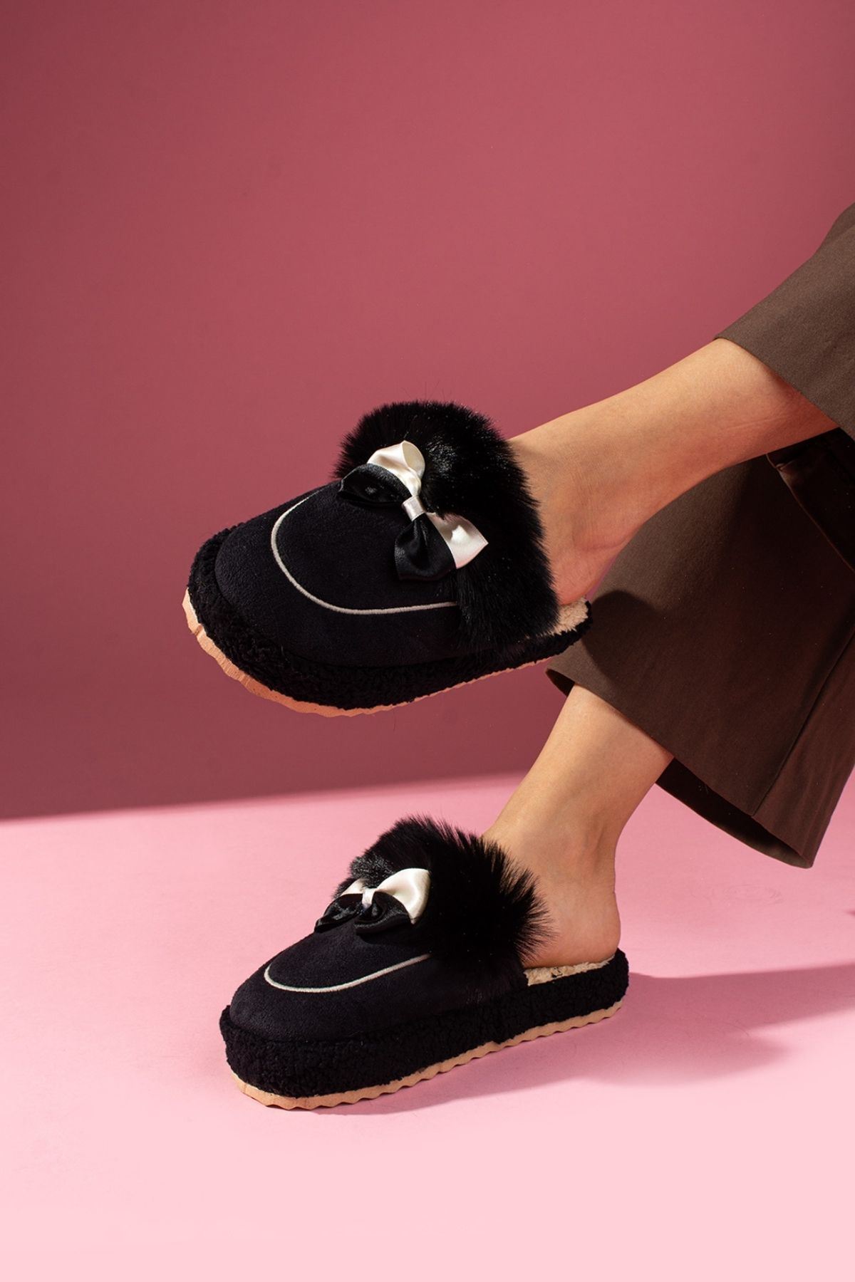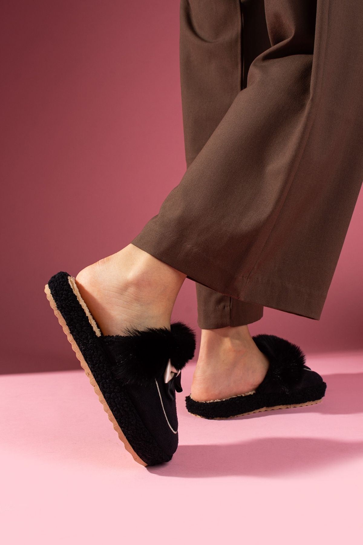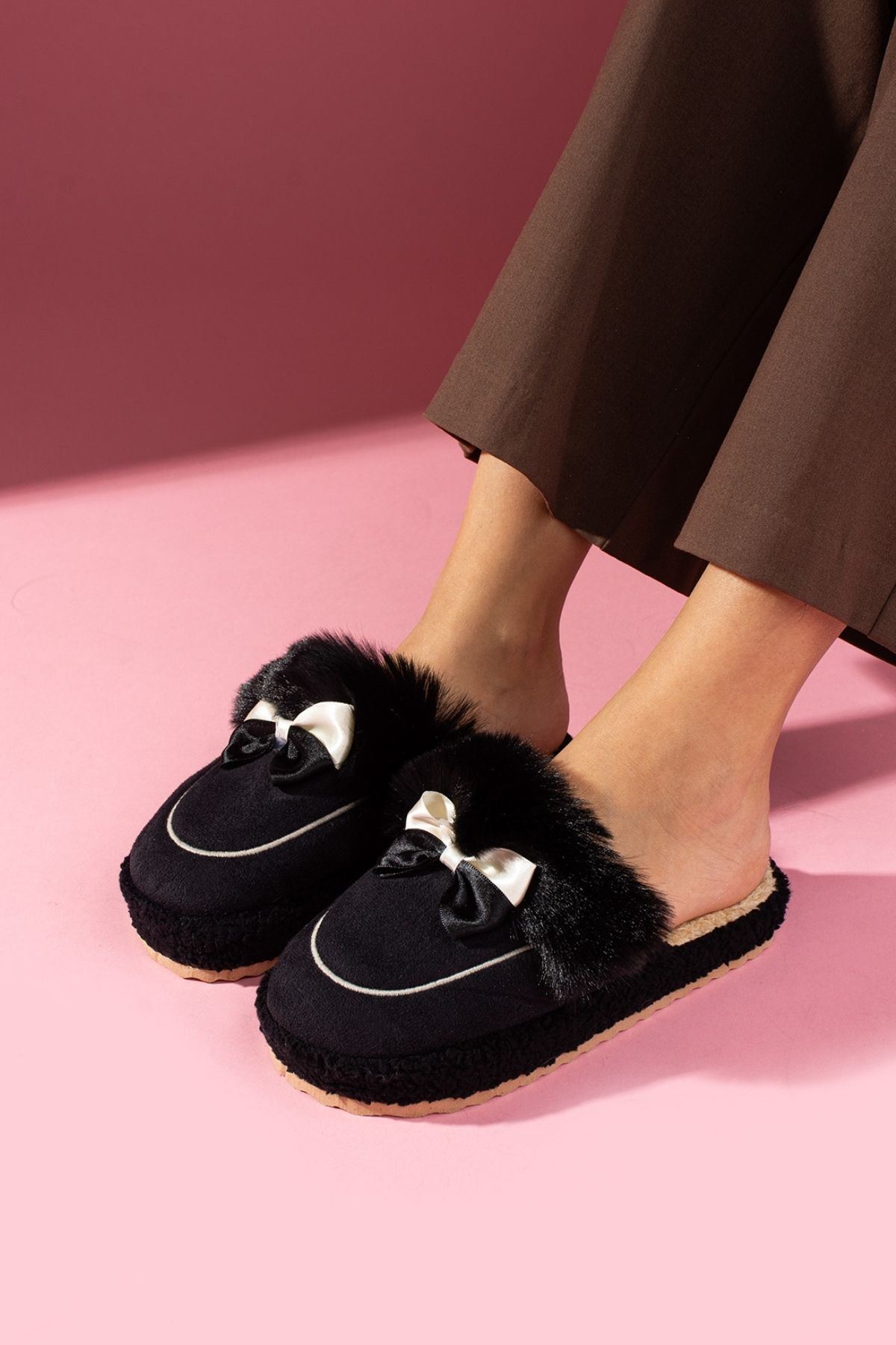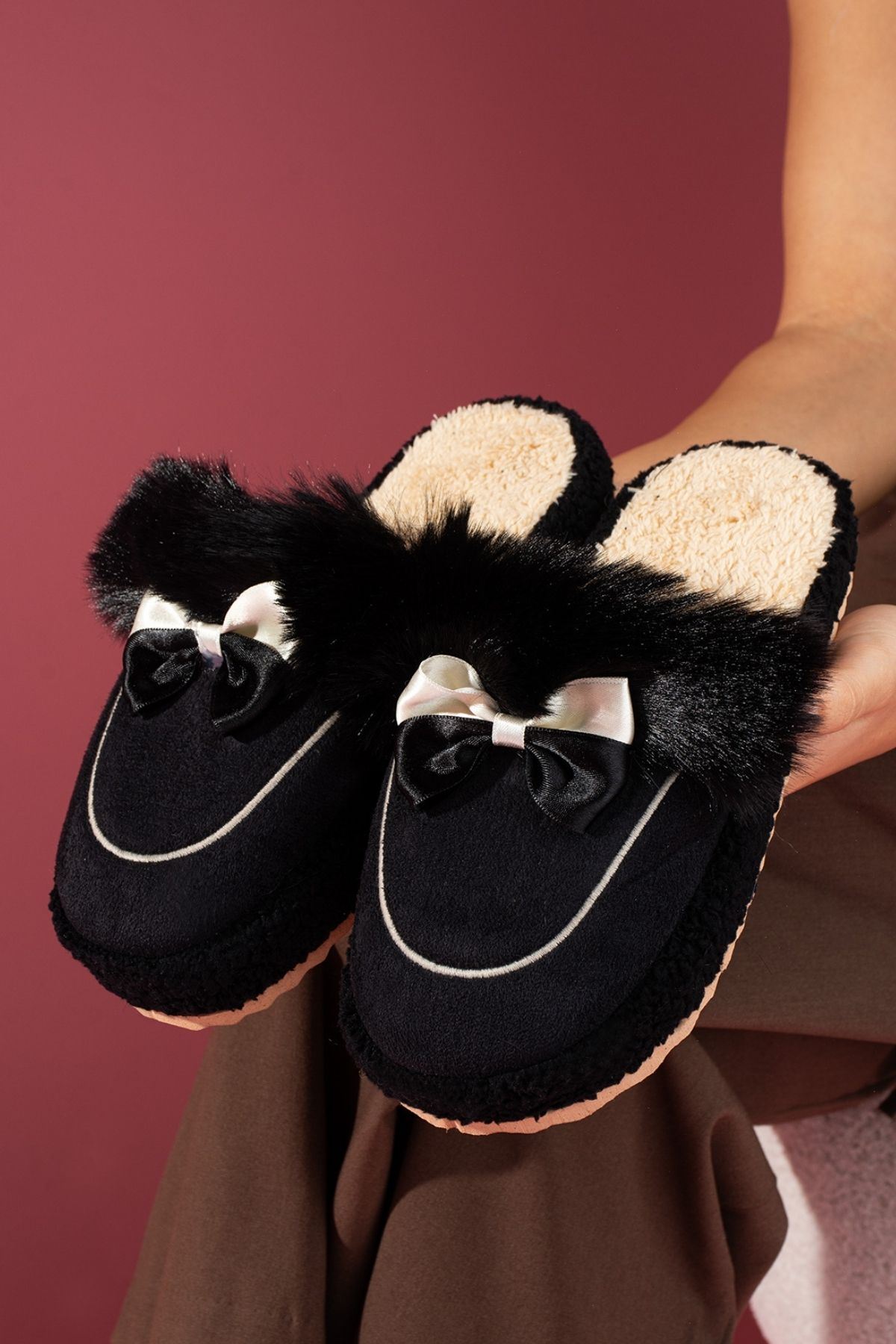 Lufina Siyah Fiyonklu Kürk Yakalı Saraç Detaylı Sessiz Taban Ev Terliği