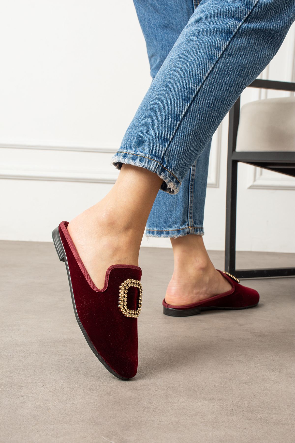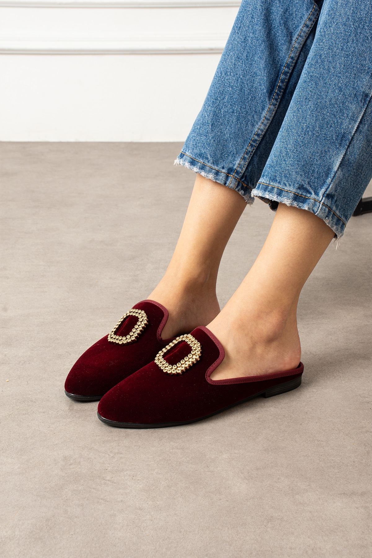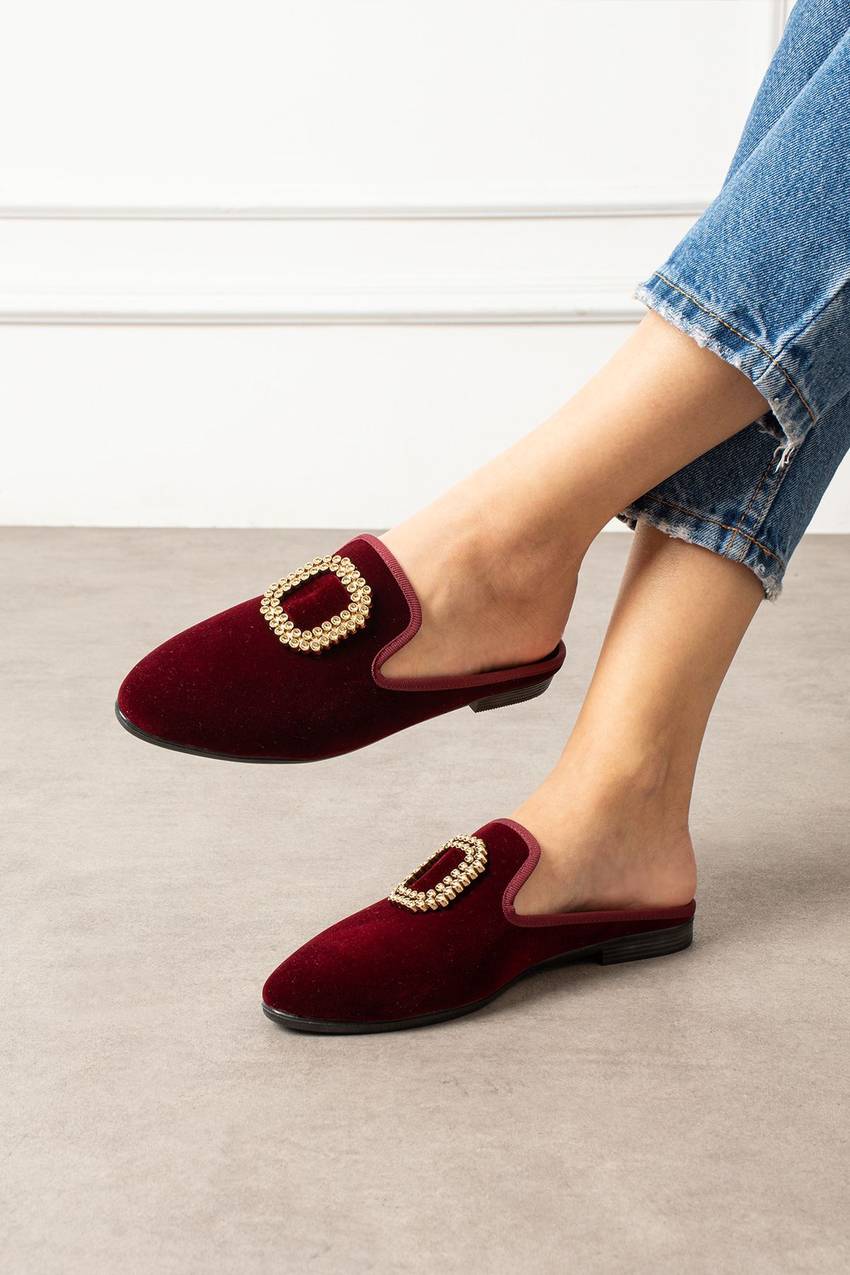 Mersel Bordo Gold Kare Aksesuarlı Elegant Ev Terliği
