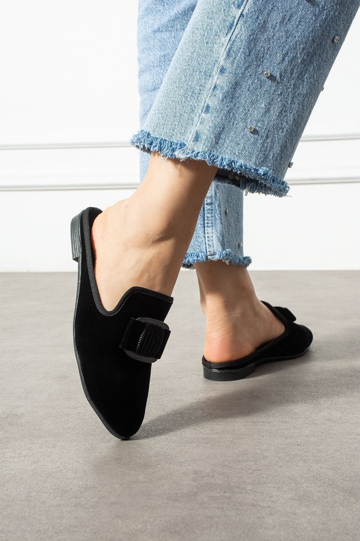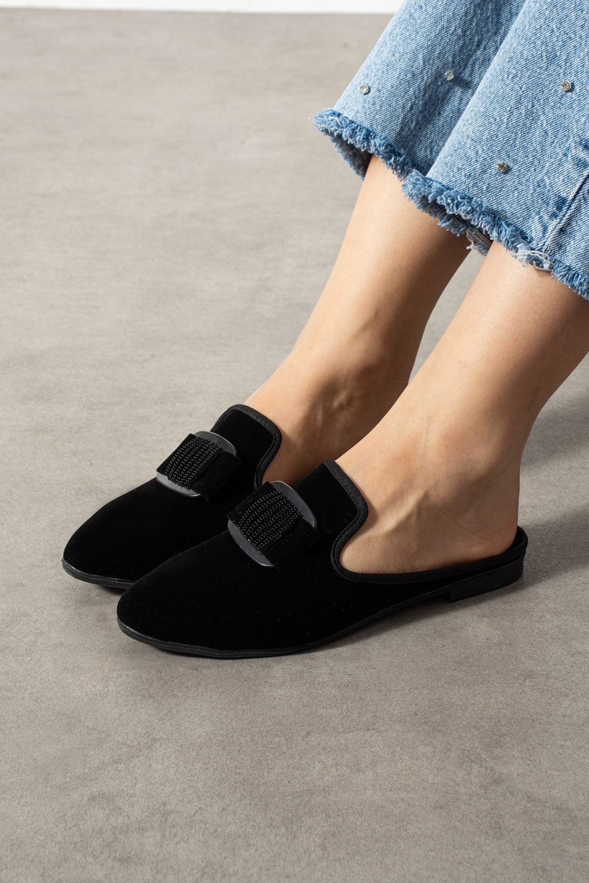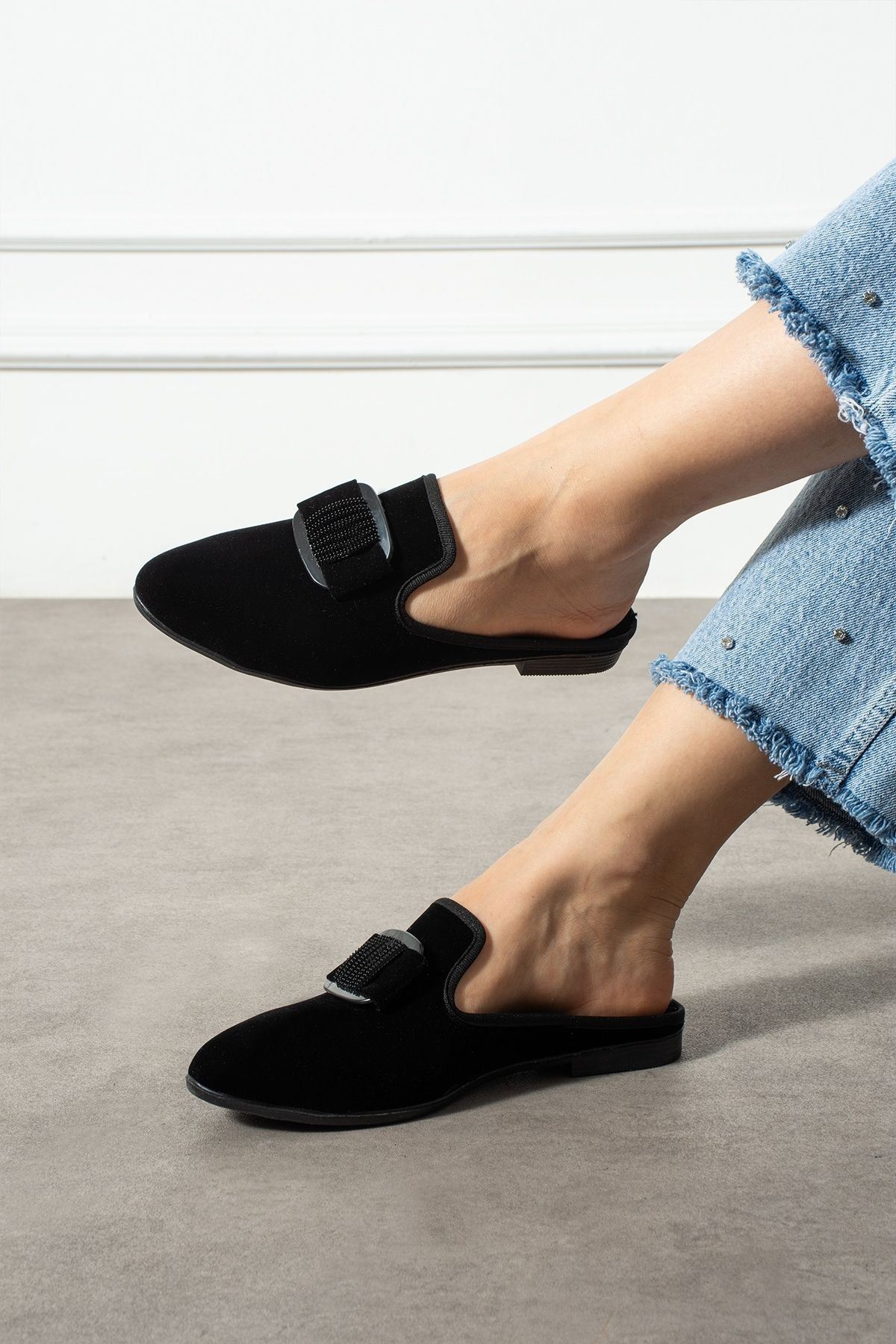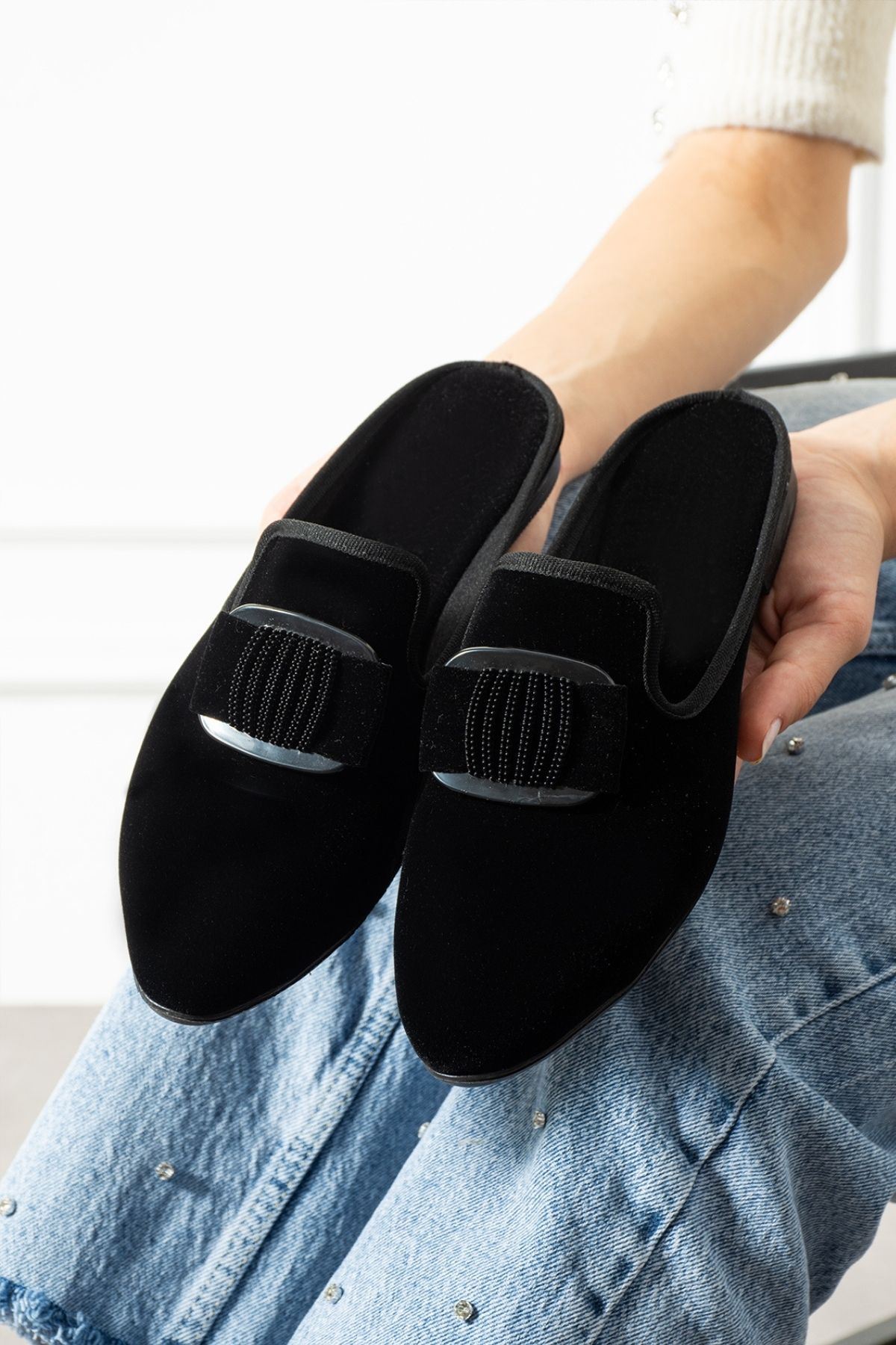 Minea Siyah Tokalı Kadife Dokulu Elegant Nişan Çeyiz Bohça Misafir Ev Terliği