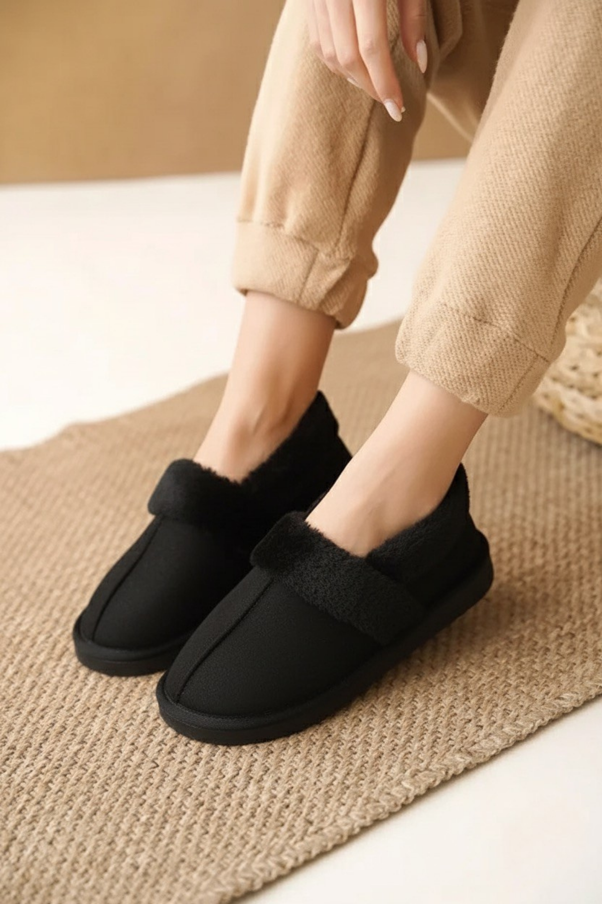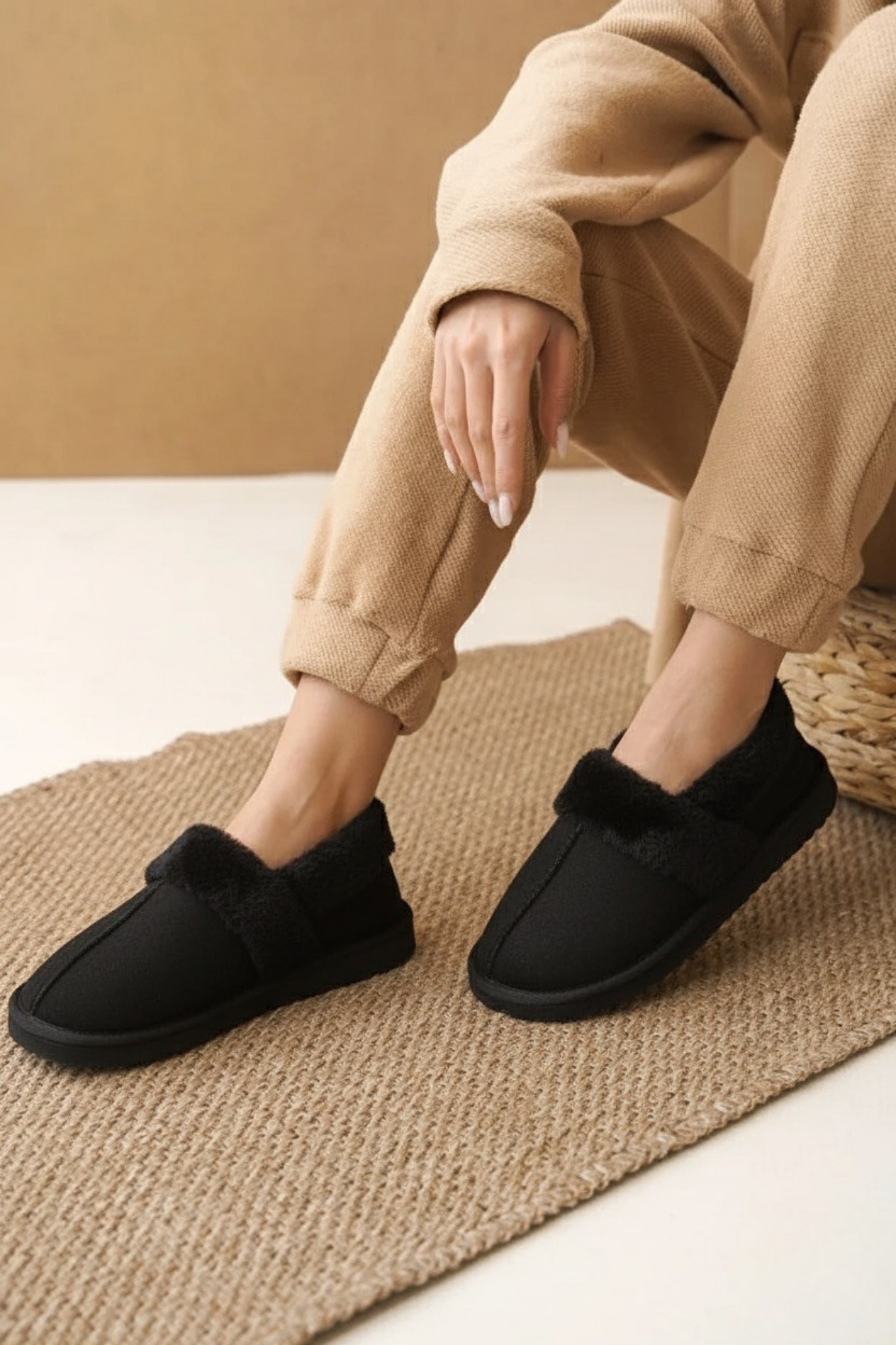 Moffy Siyah Süet Kürk Yakalı Sessiz Taban Ev Ayakkabısı