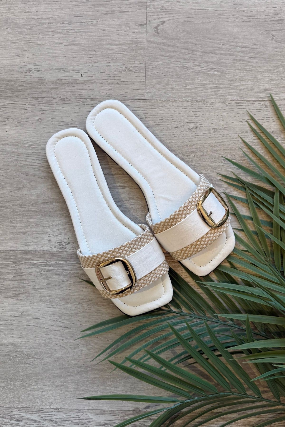 Orsato Damalı Beyaz Hasır Kemerli Gold Toka Detaylı Terlik