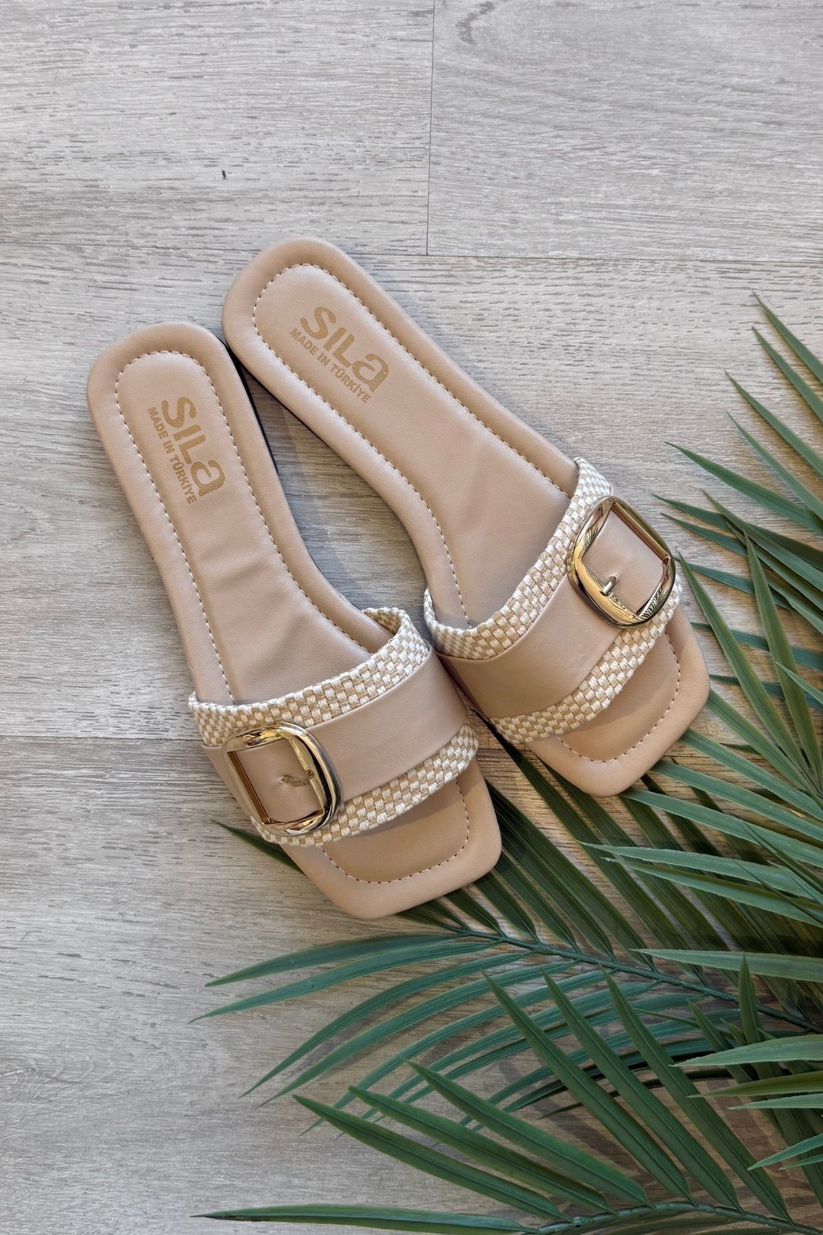 Orsato Damalı Vizon Hasır Kemerli Gold Toka Detaylı Terlik