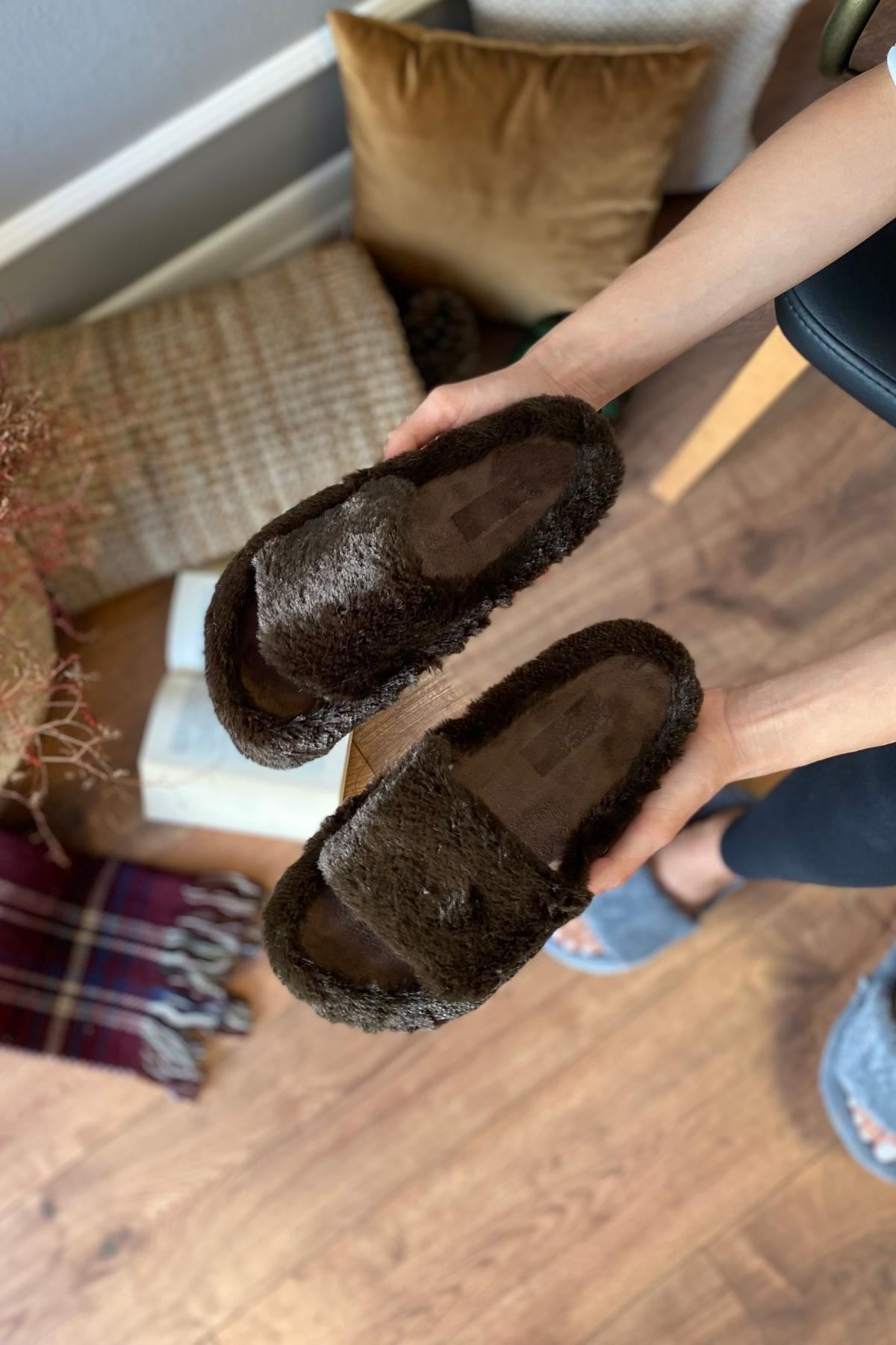Panama Kahverengi Kalın Tek Bantlı Geniş Havuzlu Tüylü Ev Terliği