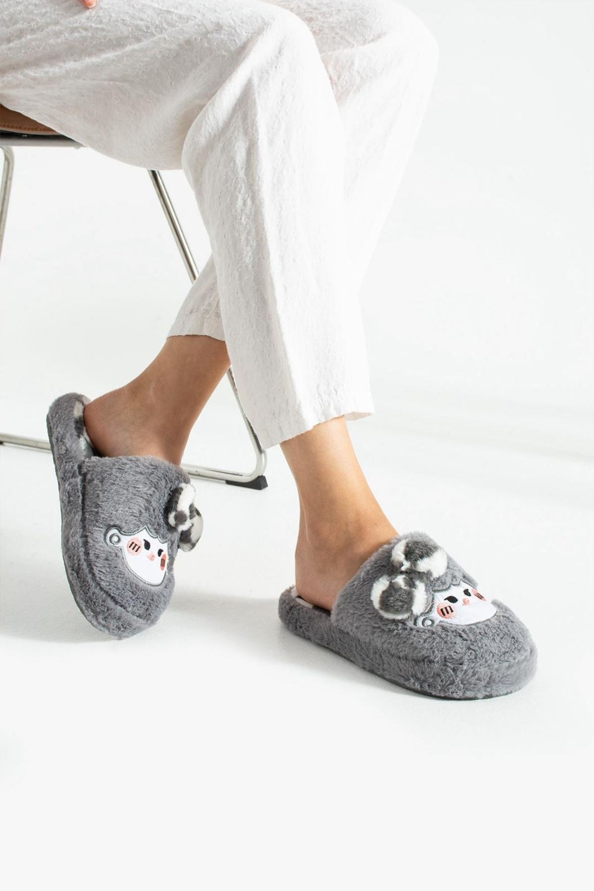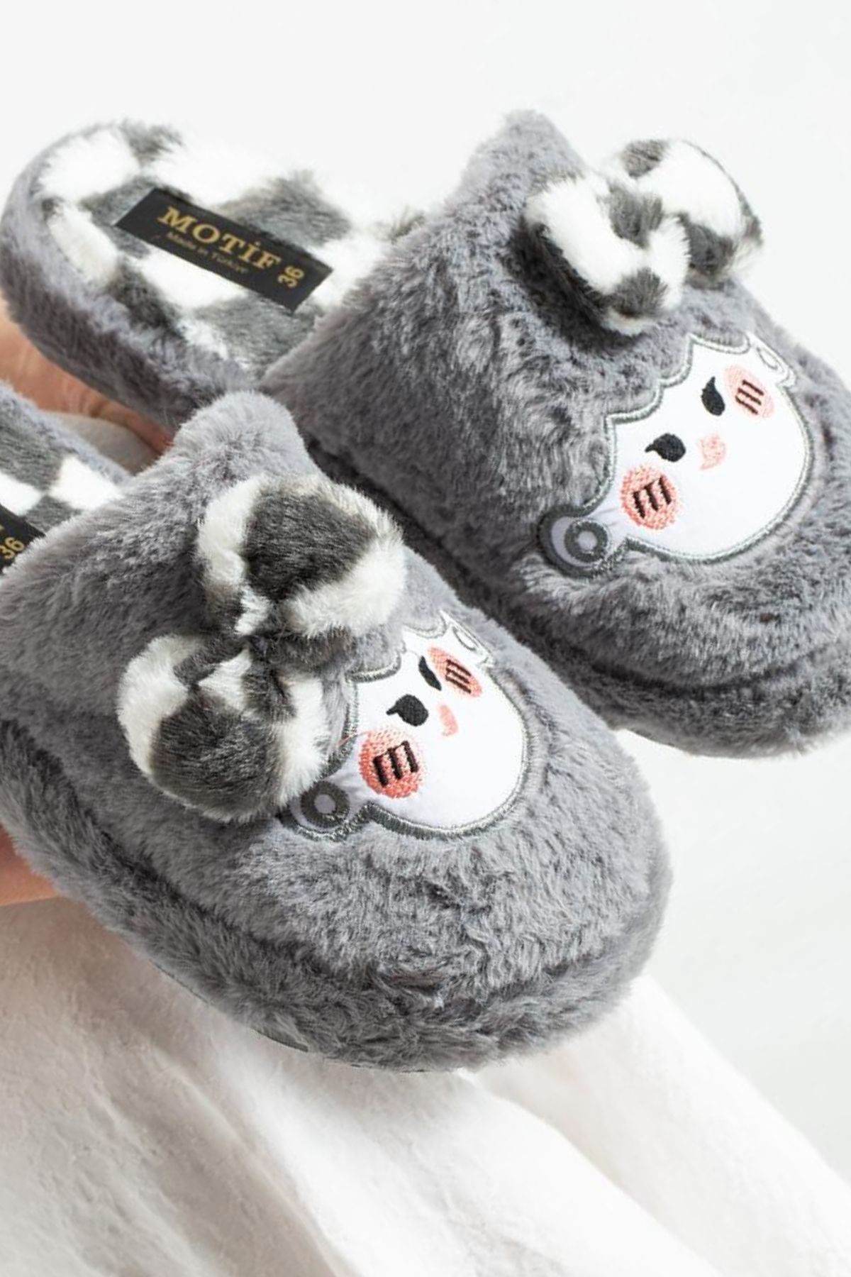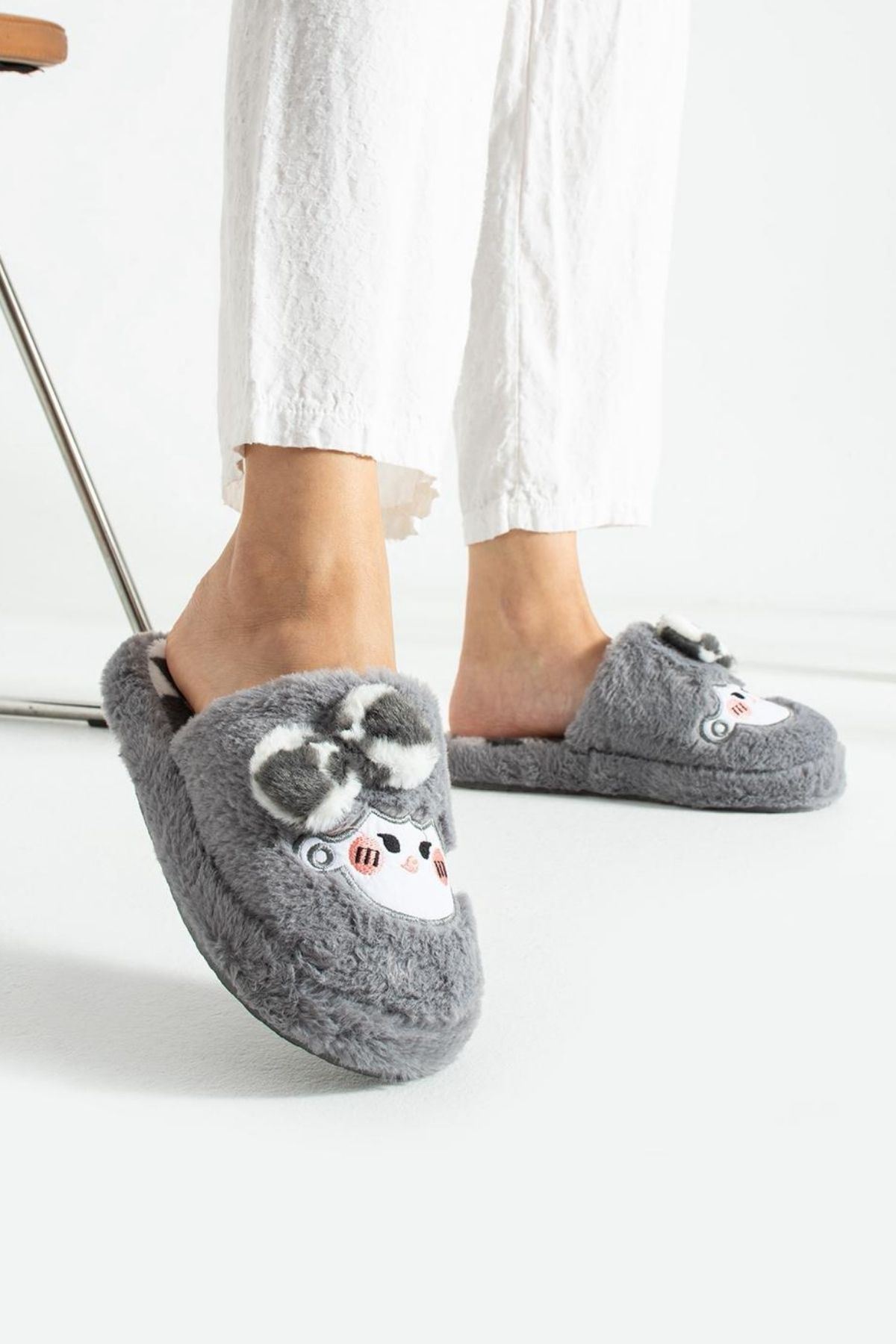 Papy Gri Papyonlu Karakter Nakışlı Peluş Kadın Sessiz Tabanlı Ev Terliği