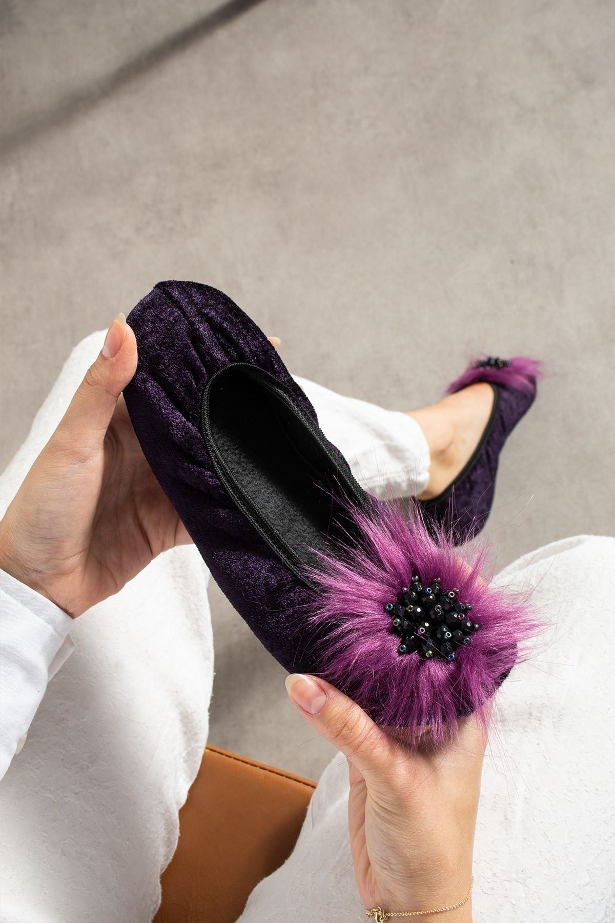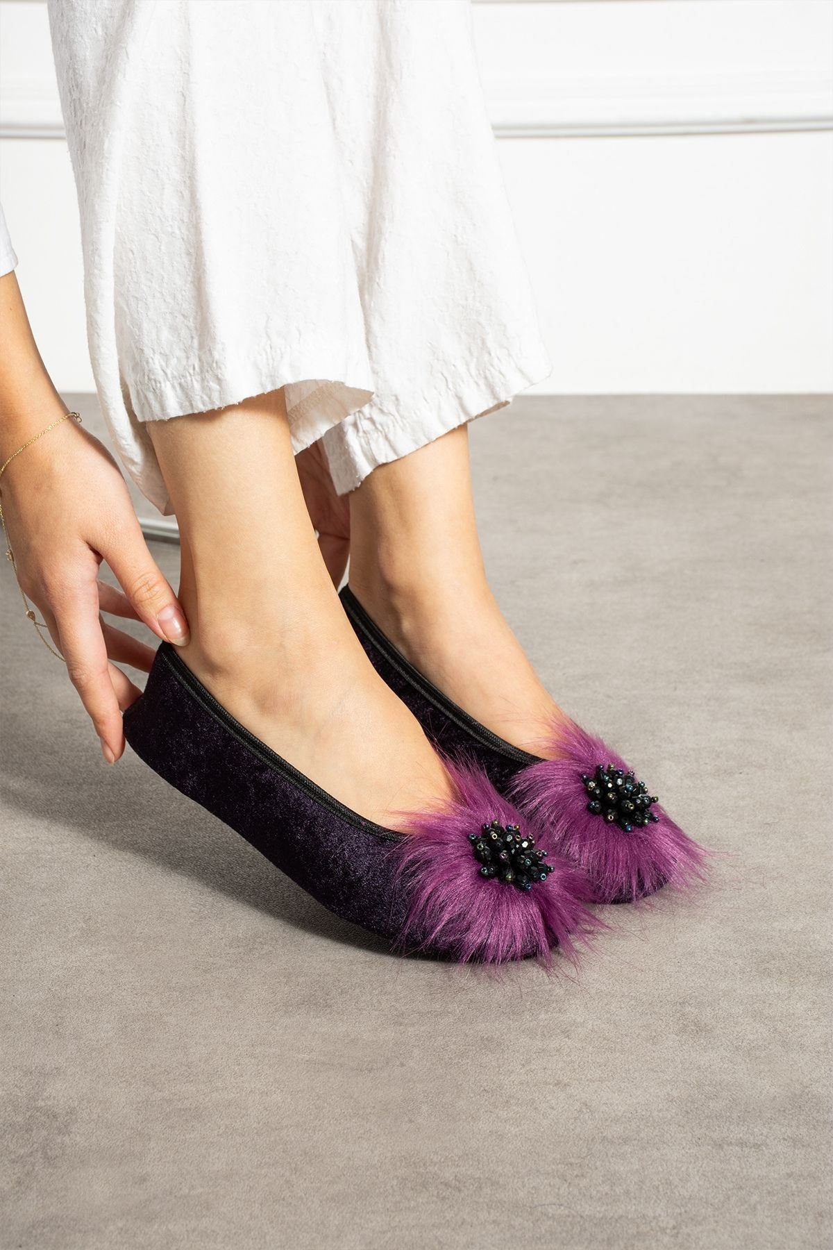 • Ön Detay: Tüylü aksesuar ve parlak taş süsleme