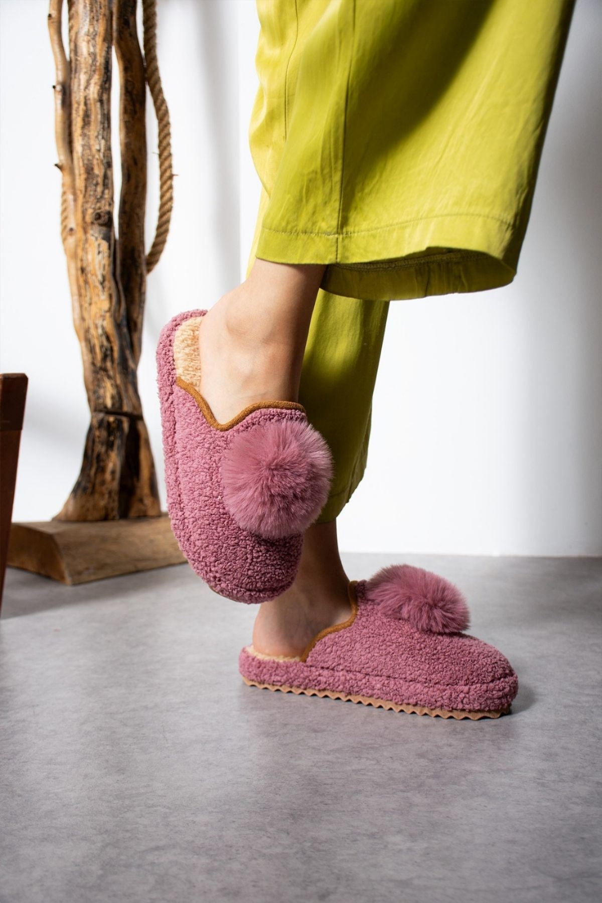 Poffina Pembe Ponponlu Saraç Detaylı Sessiz Taban Ev Terliği