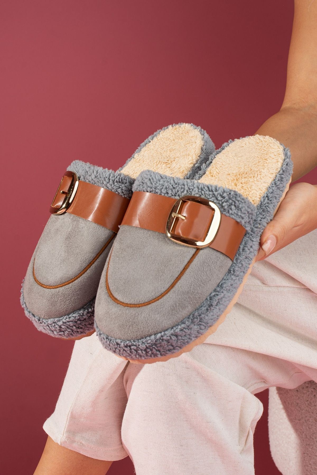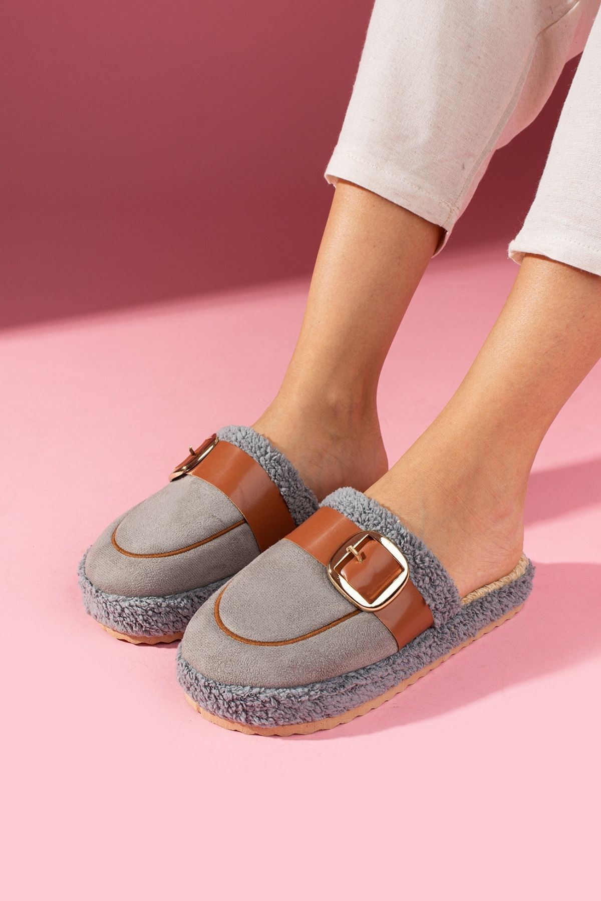 Puffita Gri Gold Tokalı Kemerli Saraç Detaylı Sessiz Taban Ev Terliği