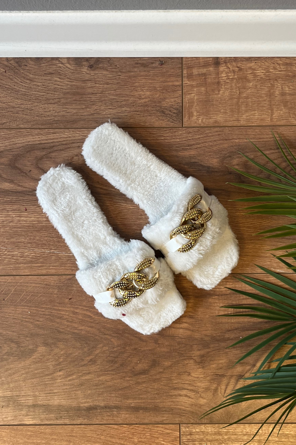 Rohan Beyaz Tüylü Zincir Tokalı Önü Açık Ev Terliği