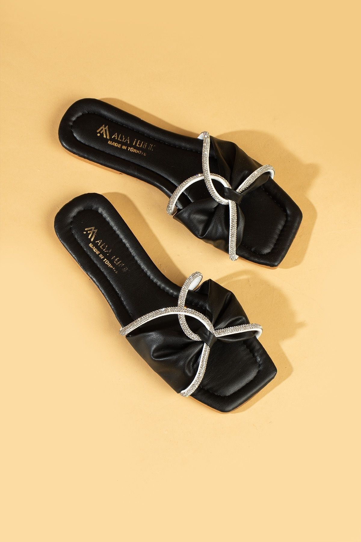 Romelu Siyah Çapraz Taş İşleme Kemer Detaylı Terlik