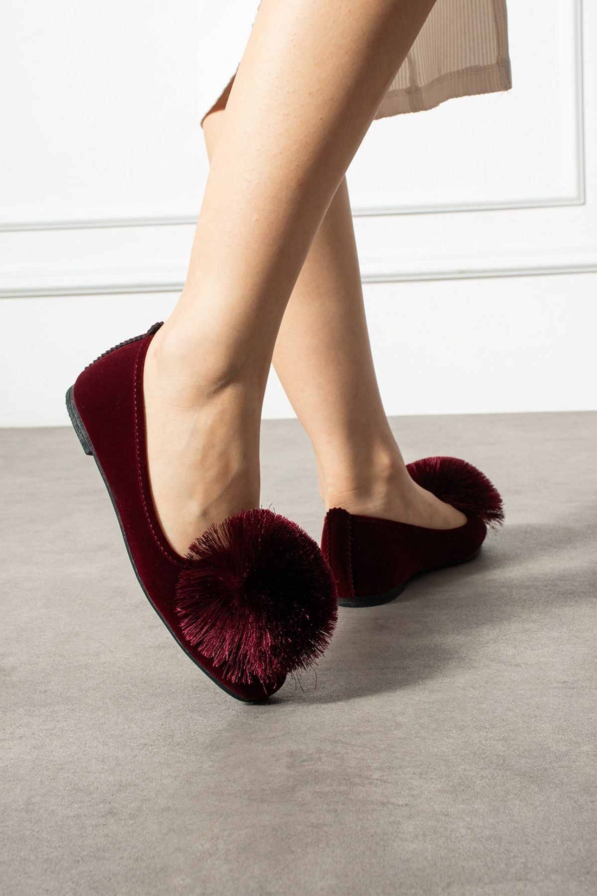 Siona Bordo Ponponlu Kadife Dokulu Elegant Nişan Çeyiz Bohça Misafir Ev Babeti
