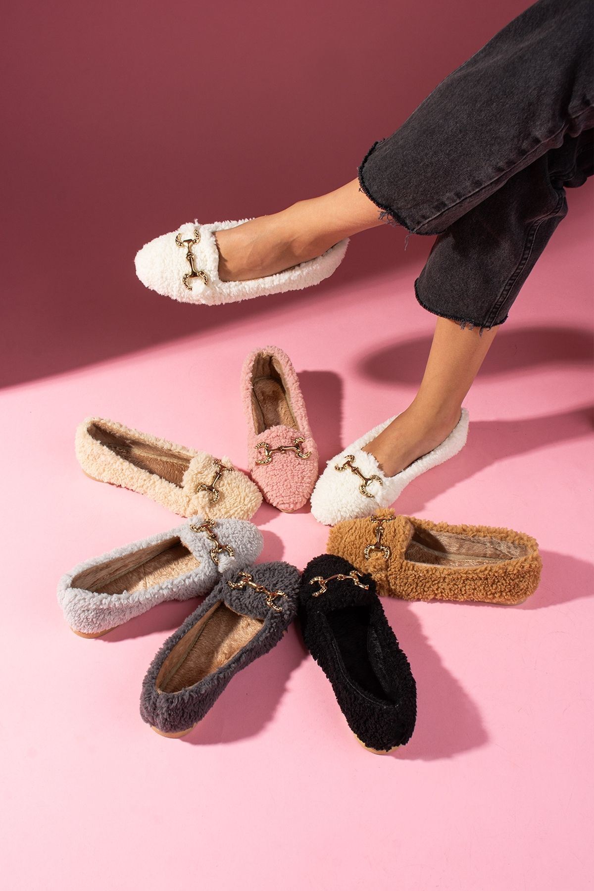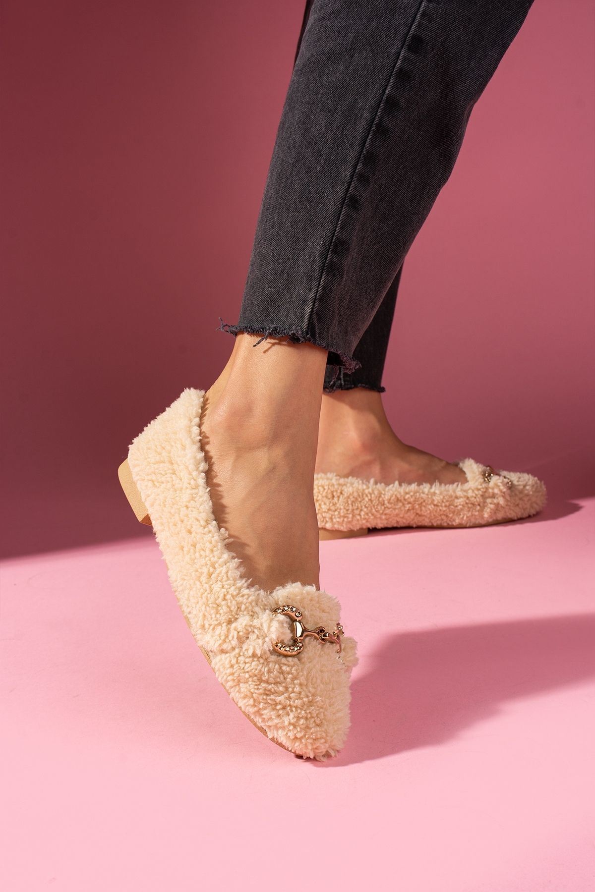 Lufina Pudra Fiyonklu Kürk Yakalı Saraç Detaylı Sessiz Taban Ev Terliği