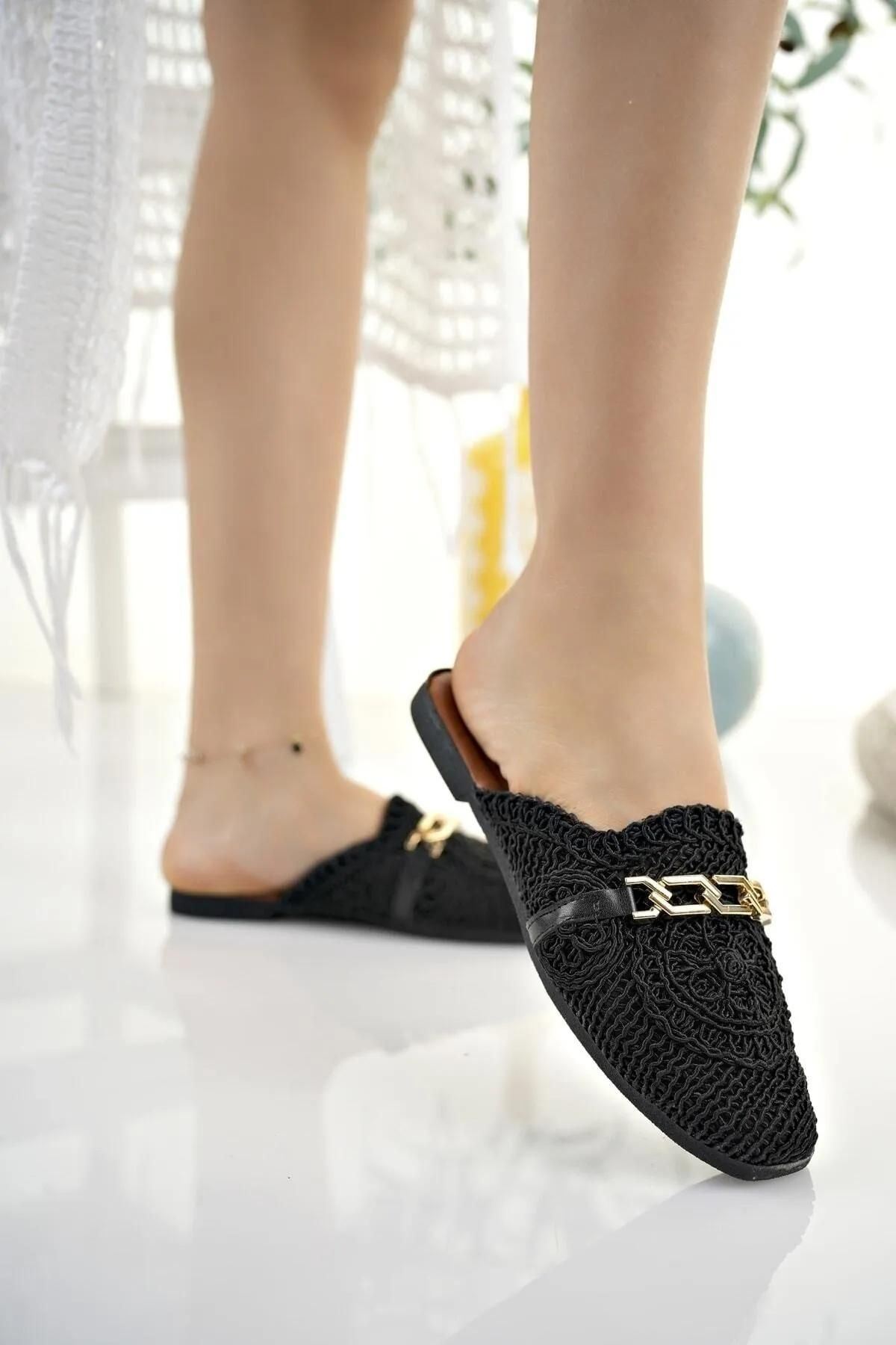 Tamara Siyah Gold Zincir Kemerli Hasır İşlemeli Terlik