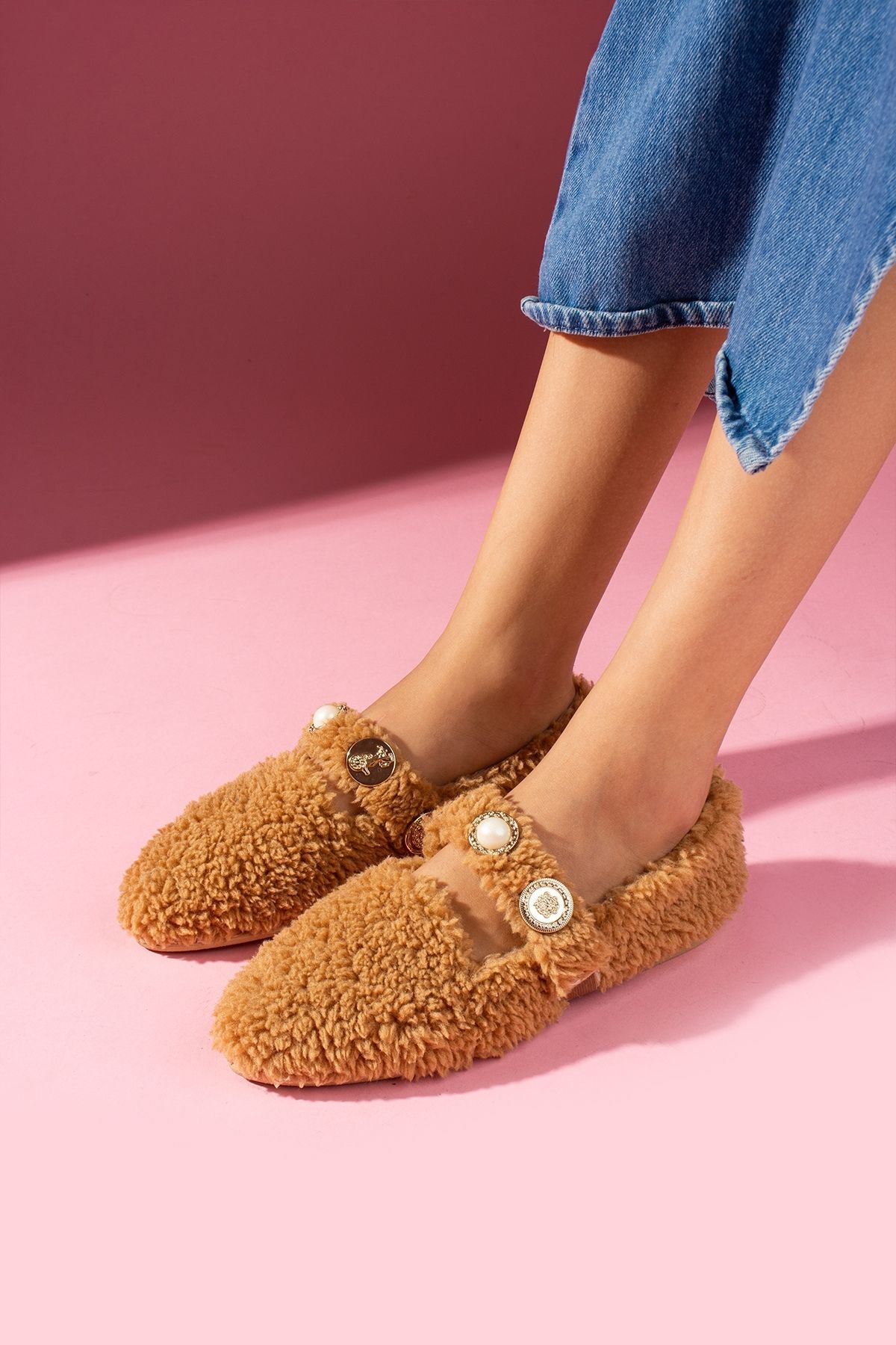 Fabian Pudra Yatay Desen İşleme Pelüş Önü Kapalı Ev Terliği