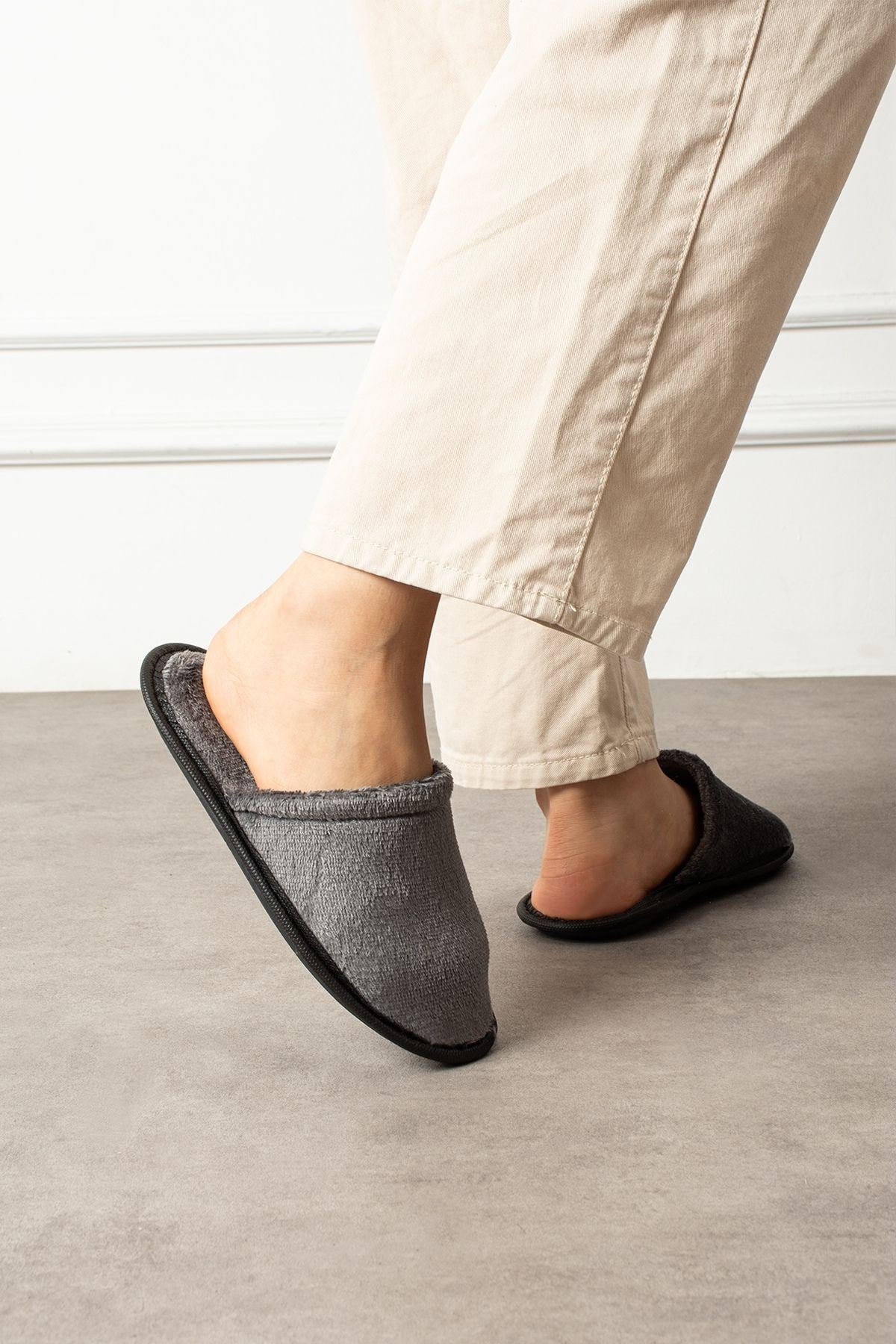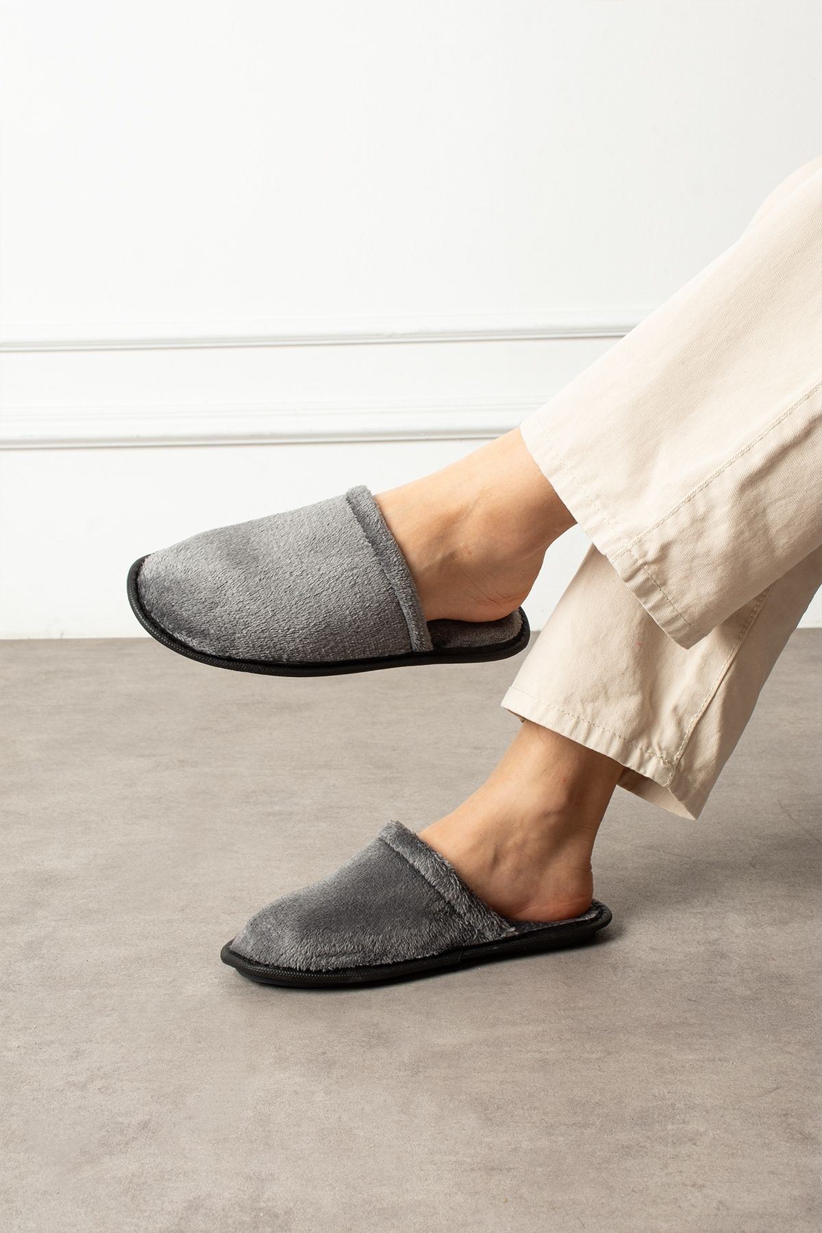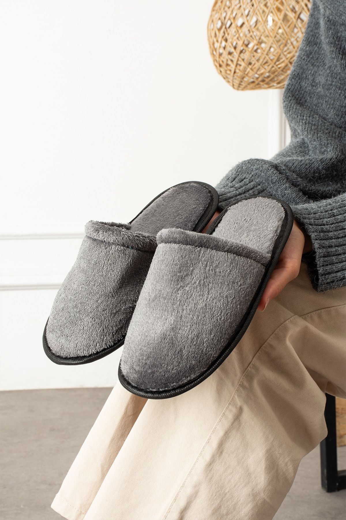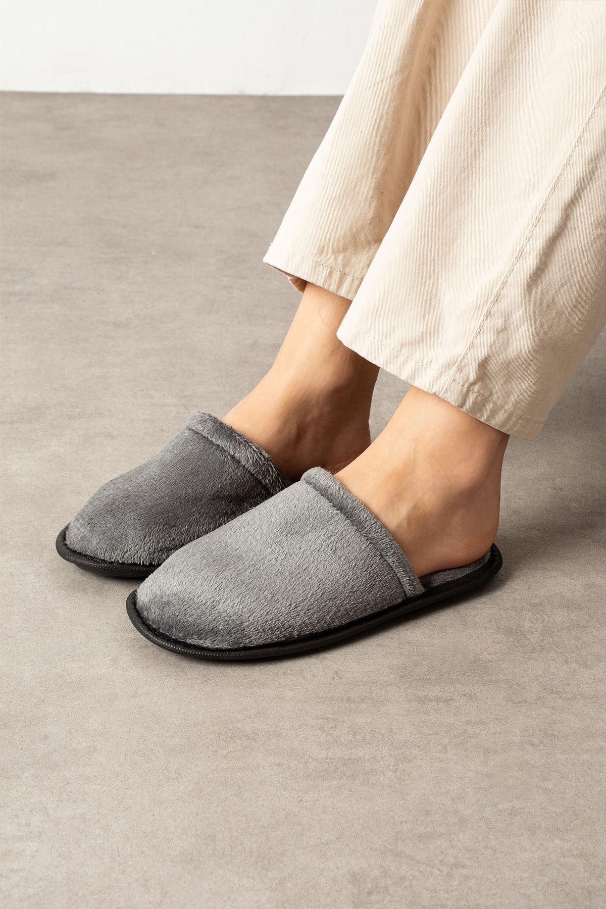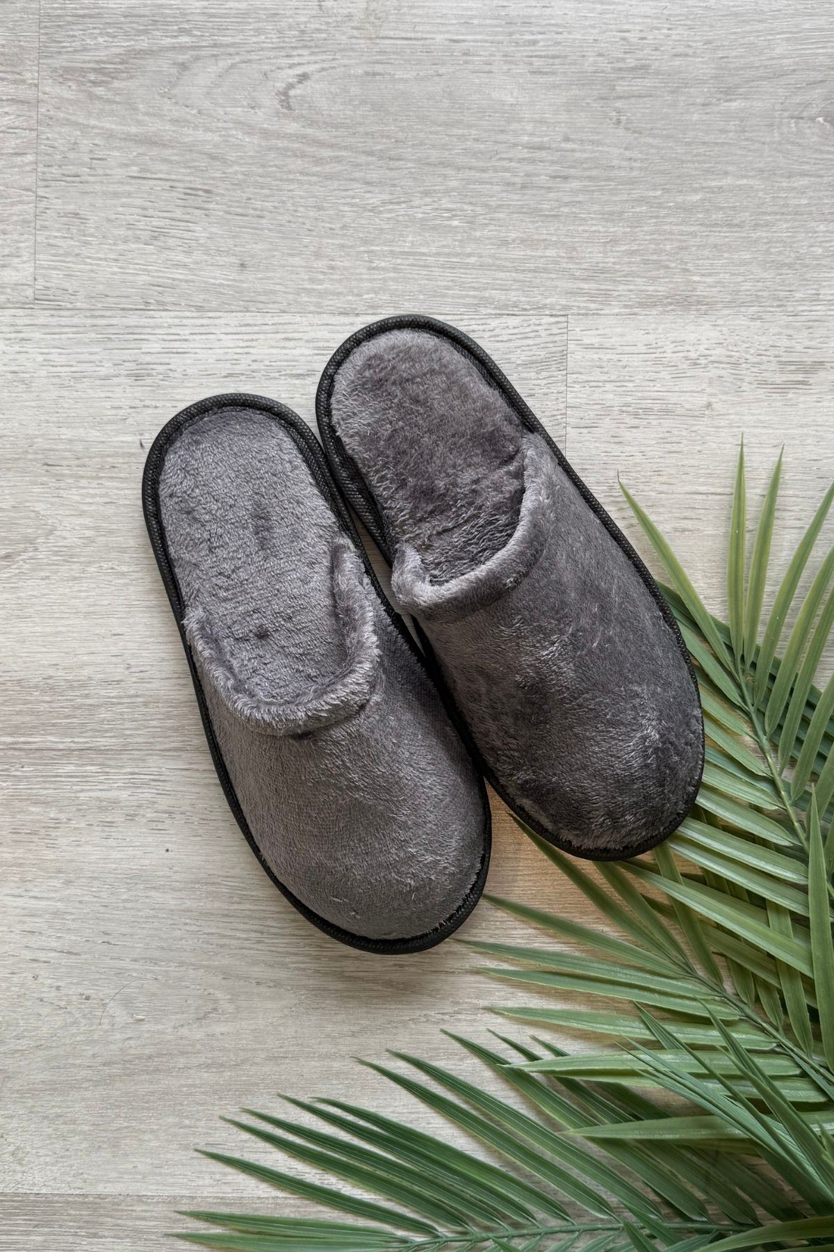 Velin Gri İçi Tüylü Önü Kapalı Ev Terliği