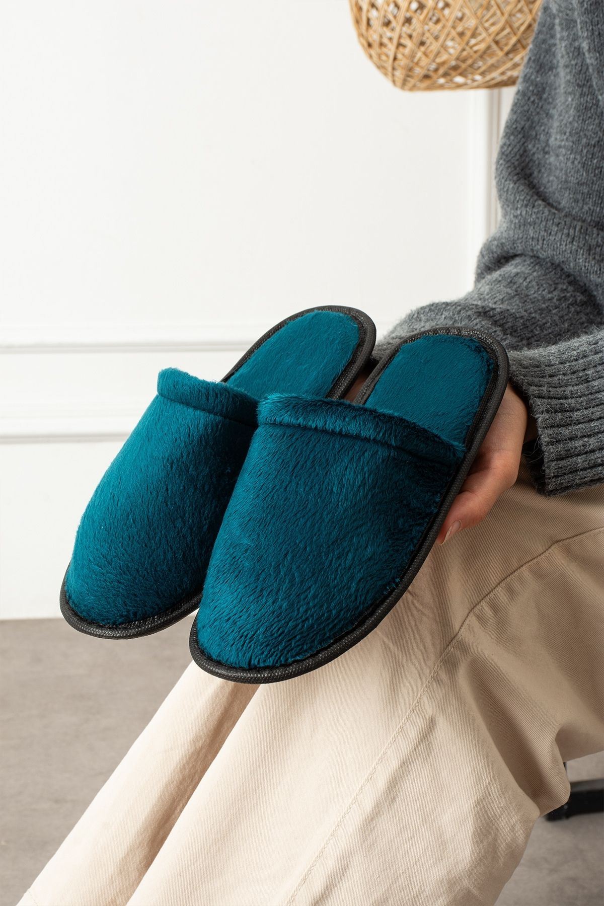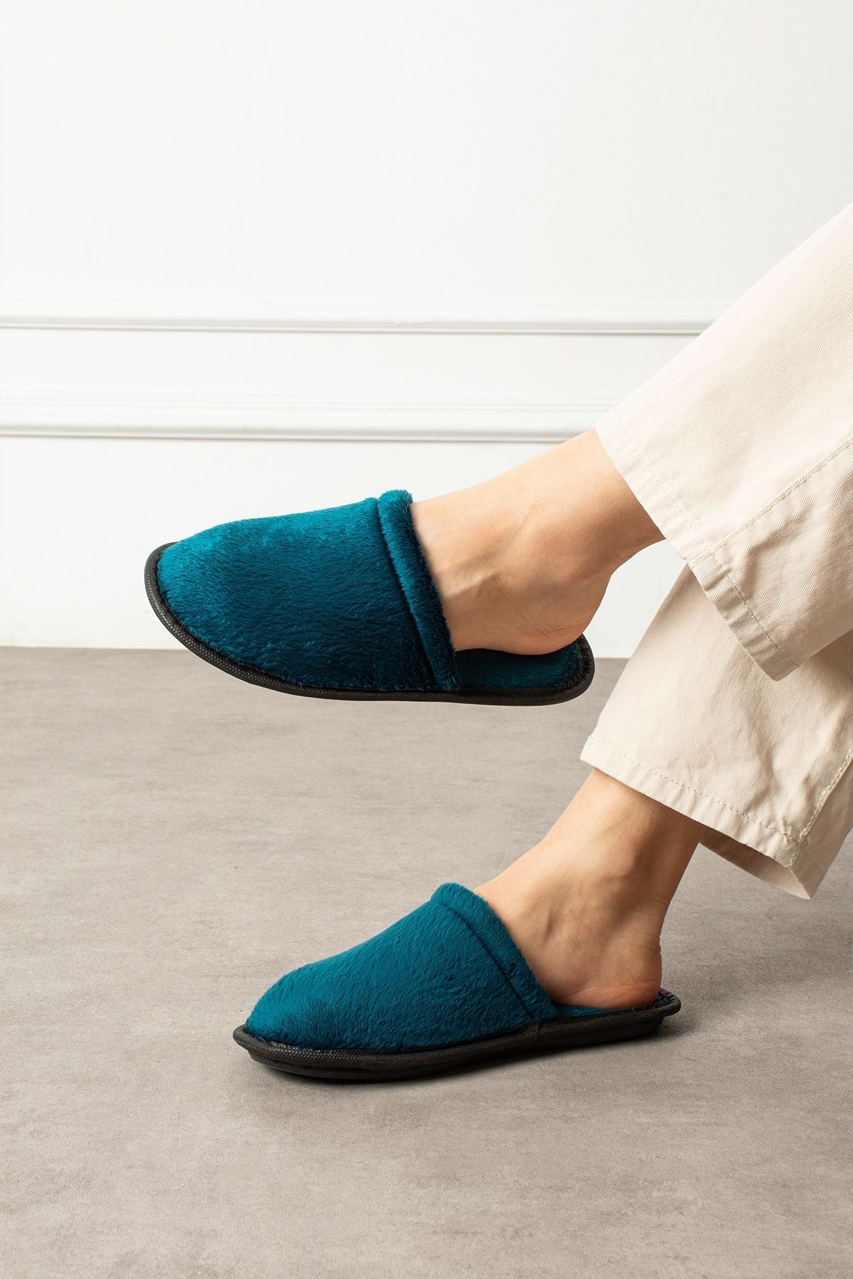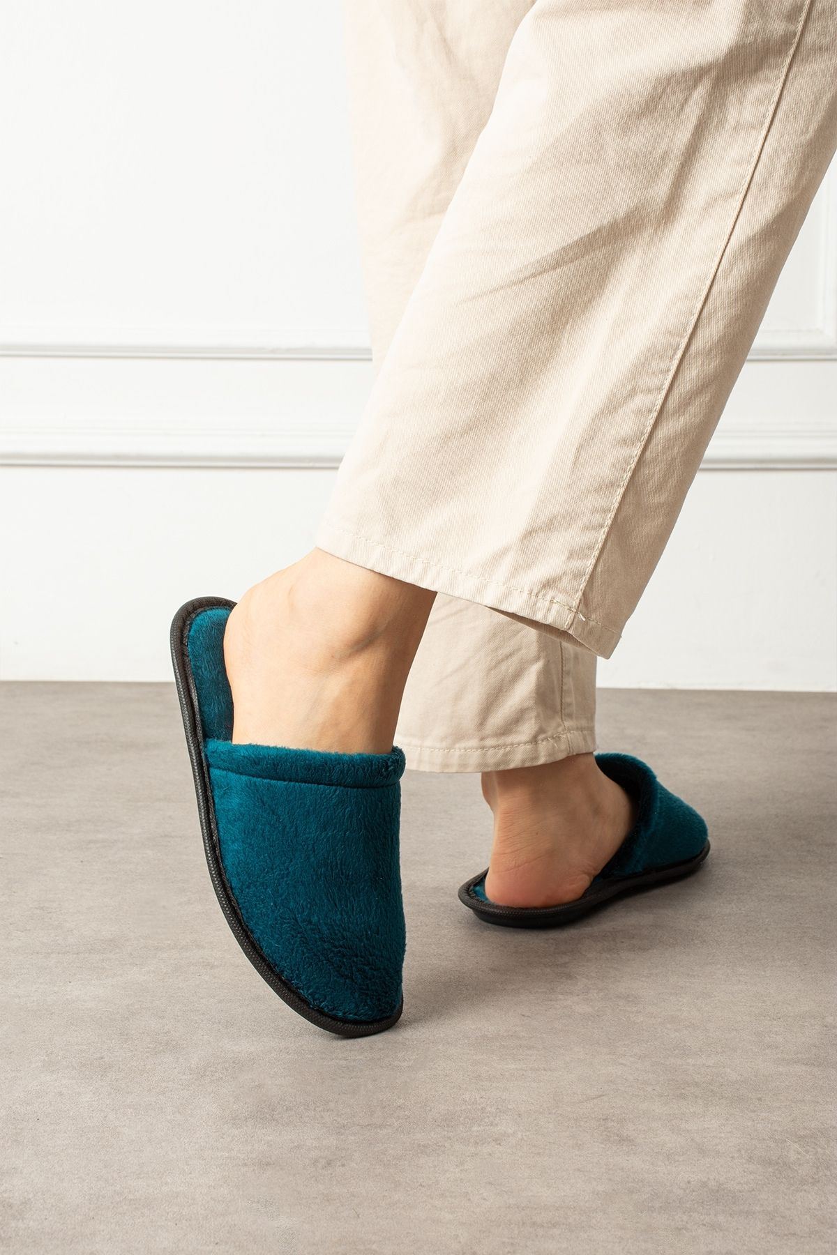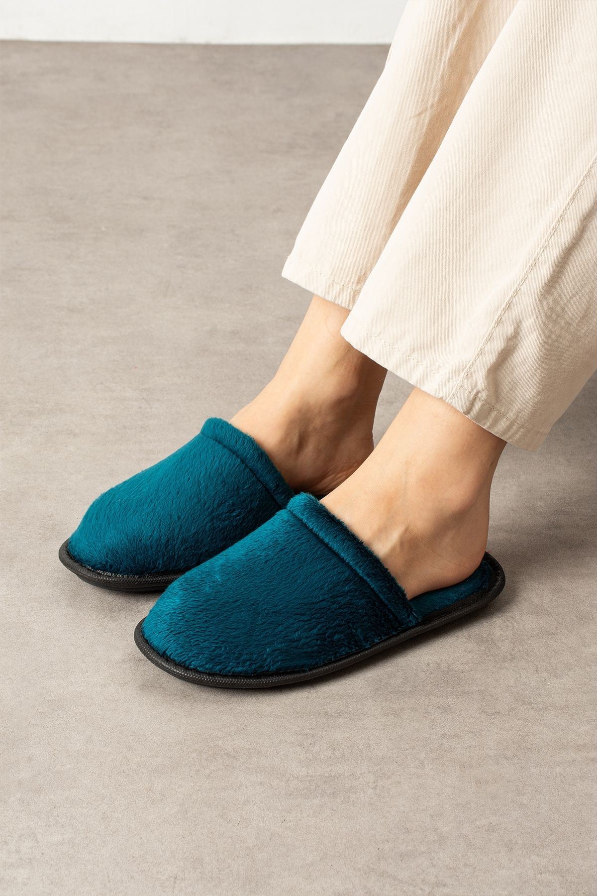 Velin Petrol Mavisi İçi Tüylü Önü Kapalı Ev Terliği