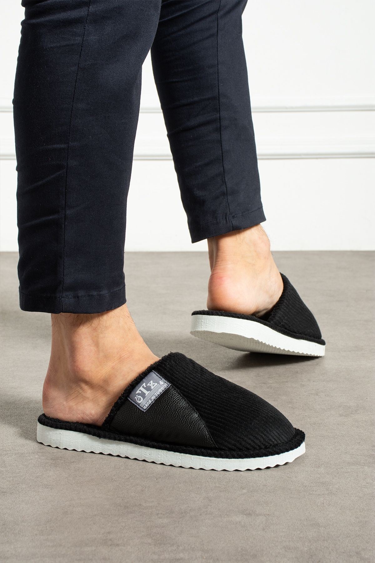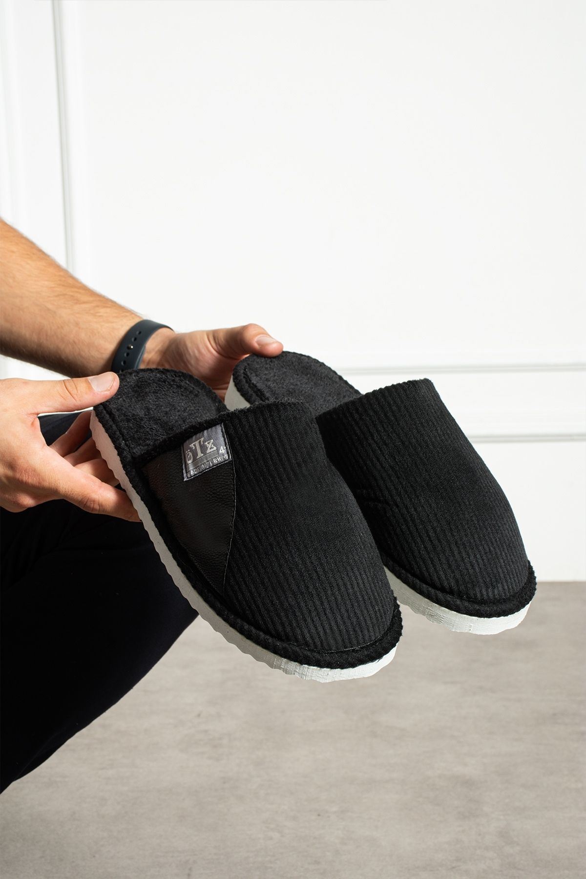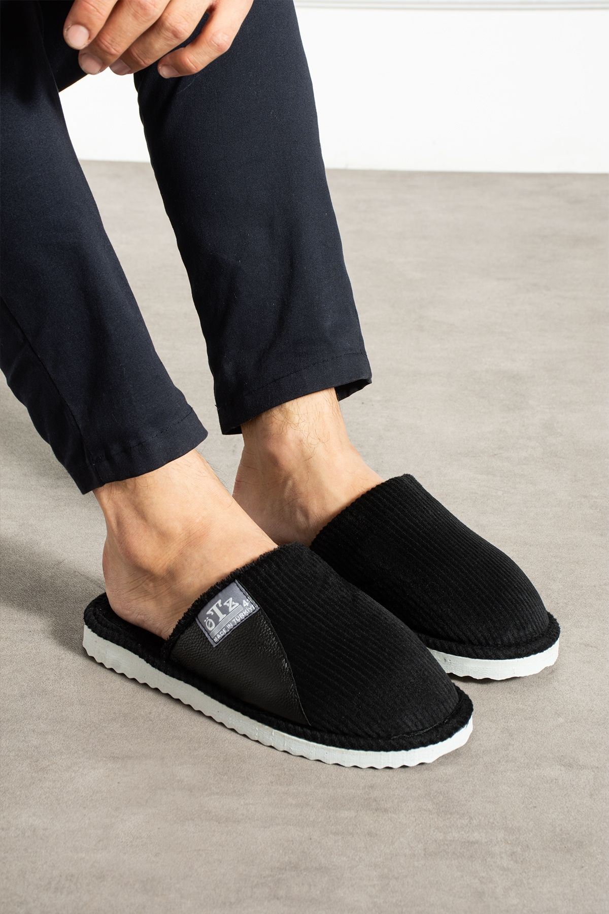 Velmor Siyah Kadife Dokulu Fitilli Deri Detaylı Erkek Ev Terliği