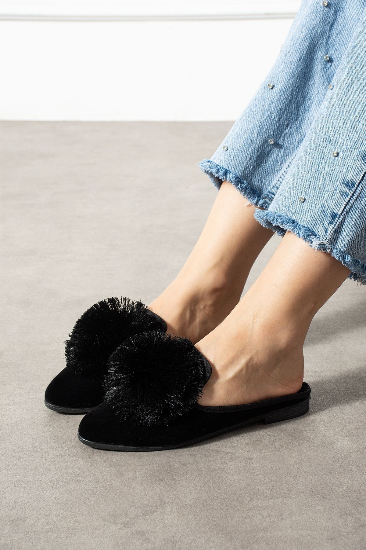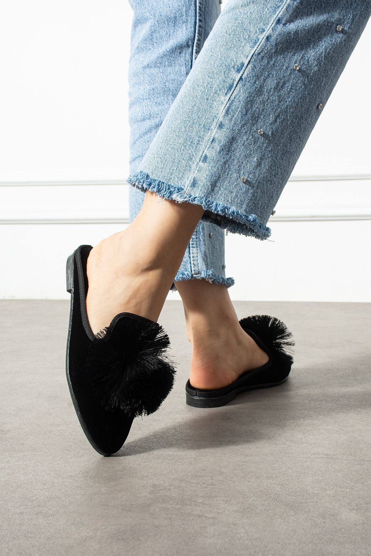Zuno Siyah Ponponlu Kadife Dokulu Elegant Nişan Çeyiz Bohça Misafir Ev Terliği